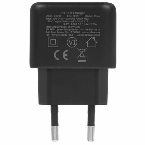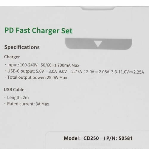| Наименование модели | CD250 (50581) USB-C 25W PD Charger + C-C 2M Cable EU - Black |