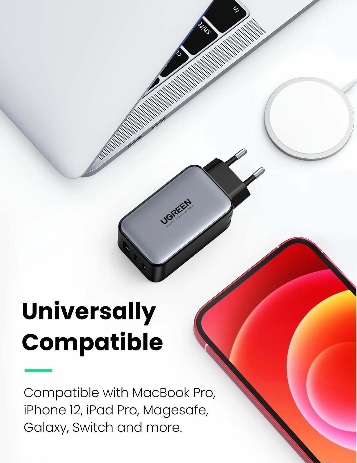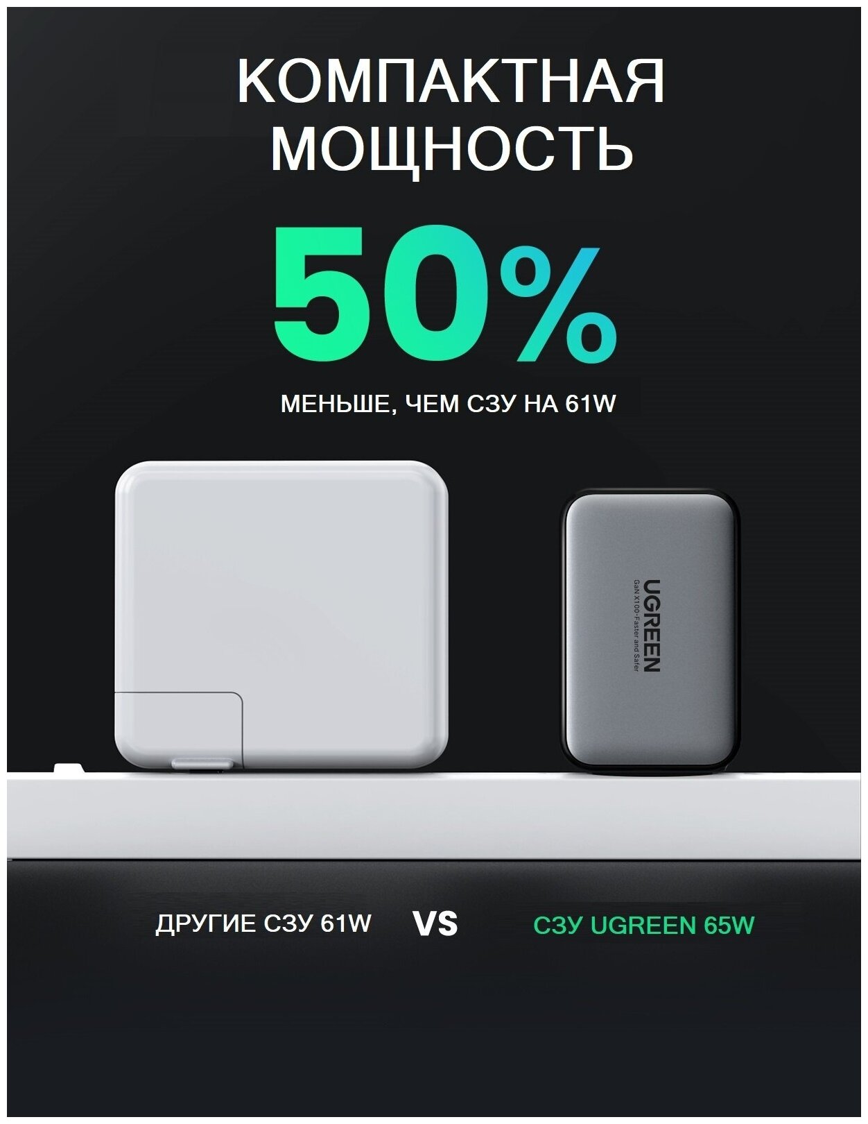 Особенности:• Выходная мощность 65 Вт;• 2 порта USB C и 1 порт USB A для зарядки;• Новейшая технология GaN для быстрой и безопасной зарядки.65 Вт, 3 порта, быстрое зарядное GaN устройство Быстрое зарядное устройство UGREEN 65 Вт, технологией Navitas GaN Power IC, имеет меньший размер, но большую мощность. Одновременно заряжайте 3 устройства на полной скорости и экономьте до 1 часа вашего времени с зарядным устройством UGREEN 65 Вт. Все порты поддерживают соглашение о контроле качества (быстрая зарядка). Только одно зарядное устройство удовлетворяет все ваши потребности в зарядке.Меньший нагрев и более высокая эффективность зарядки Одним из основных факторов, влияющих на энергоэффективность, является способность рассеивания тепла. Полупроводник из нитрида галлия (GaN) третьего поколения помогает зарядному устройству выделять меньше тепла и ускоряет процесс его рассеивания. В то же время это зарядное устройство обеспечивает двойную плотность мощности и снижает ее потери на 80%, что также означает повышение энергоэффективности.Легкое и мобильное Легко носить с собой, это зарядное устройство обеспечивает максимальную мобильность.Зарядное устройство GaN PD, все в одном В зарядном устройстве применен новейшая технология GaN, которая позволяет силовым компонентам работать при более высоком напряжении и более частых переключениях, что повышает эффективность зарядки при еще более компактной конструкции.Технические данные:• Вход: 100-240V~50/60Hz 1.8A Max• USB-C Выход 1:5.0V=3.0A 9.0V=3.0A 12.0V=3.0A 15.0V=3.0A 20.0V=3.25A 3.3-21.0V=3.0A• USB-C Выход 2:5.0V=3.0A 9.0V=3.0A 12.0V=3.0A 15.0V=3.0A 20.0V=3.25A 3.3-21.0V=3.0A• USB-A Выход:4.5V=5.0A 5.0V=4.5A 5.0V=3.0A 9.0V=2.0A 12.0V=1.5A