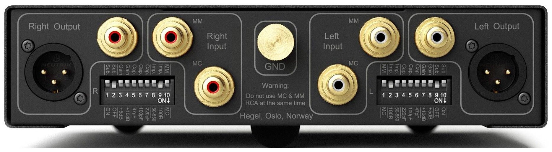 На задней панели устройства находятся RCA-входы для MM и MC-звукоснимателей, а также балансные и небалансные выходы. Контакты всех разъемов позолочены для сохранения стабильного соединения в течение длительного времени. Около разъемов каждого канала находятся микропереключатели для настройки входных параметров, а также изменения коэффициента усиления. Это позволяет оптимально настроить Hegel V10 для работы с разными моделями картриджей. Аудиосхема фонокорректора построена на малошумящих полевых JFET-транзисторах, при этом на входе для MC-картриджа используется по четыре таких транзистора в каждом канале, включенных параллельно. Это исключило протекание тока через катушки звукоснимателя и устранило фоновые шумы.