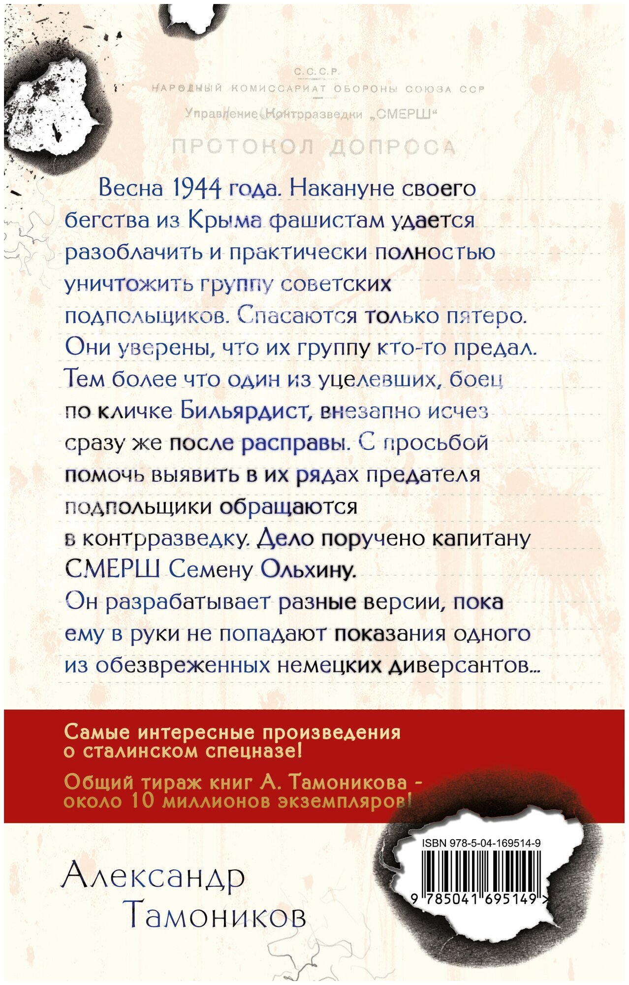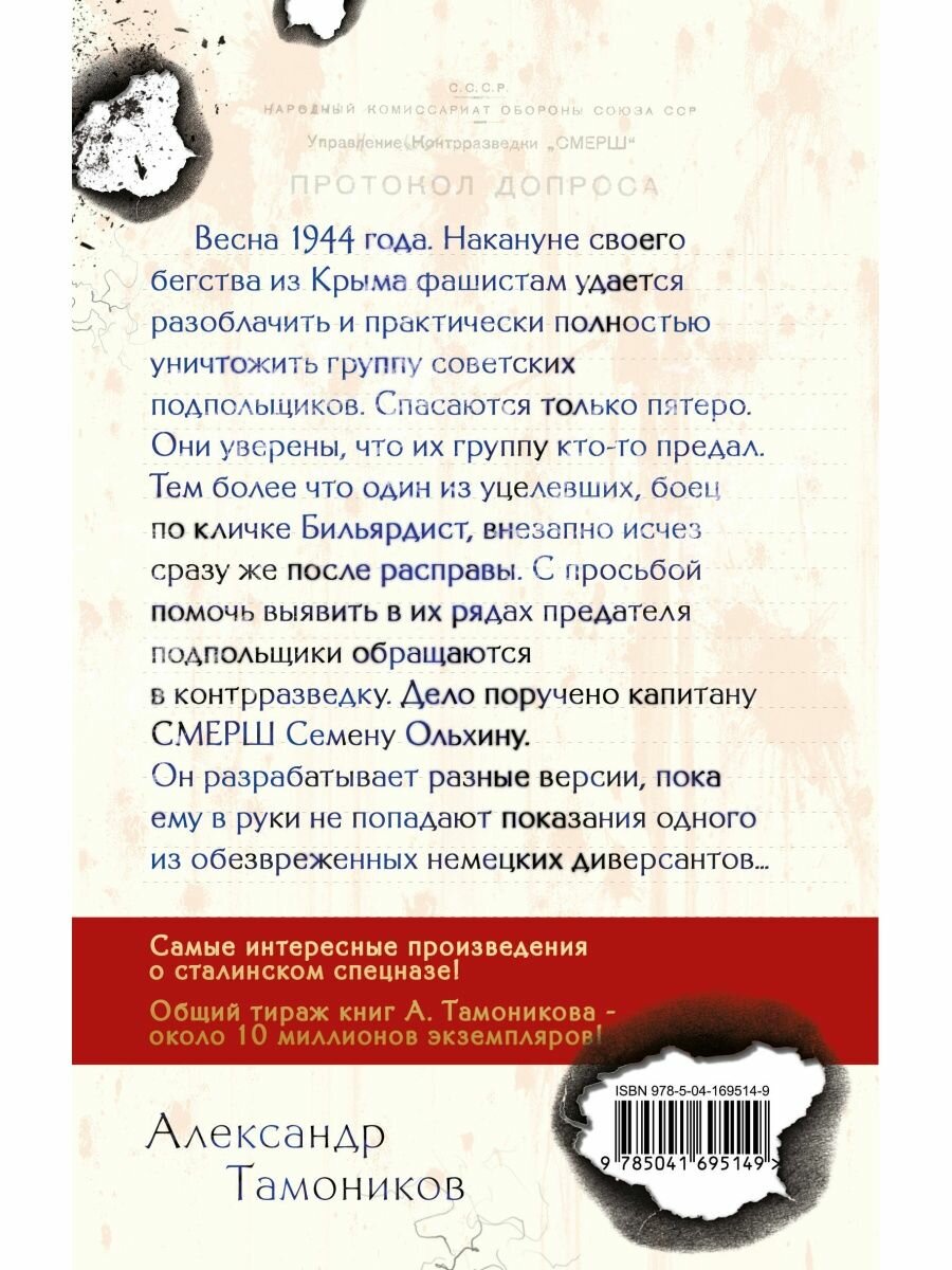 Весна 1944 года. Накануне своего бегства из Крыма фашистам удается разоблачить и практически полностью уничтожить группу советских подпольщиков. Спасаются только пятеро. Они уверены, что их группу кто-то предал. Тем более что один из уцелевших, боец по кличке Бильярдист, внезапно исчез сразу же после расправы. С просьбой помочь выявить в их рядах предателя подпольщики обращаются в контрразведку. Дело поручено капитану СМЕРШа Семену Ольхину. Он начинает прорабатывать разные версии, пока ему в руки не попадают показания одного из обезвреженных немецких диверсантов…