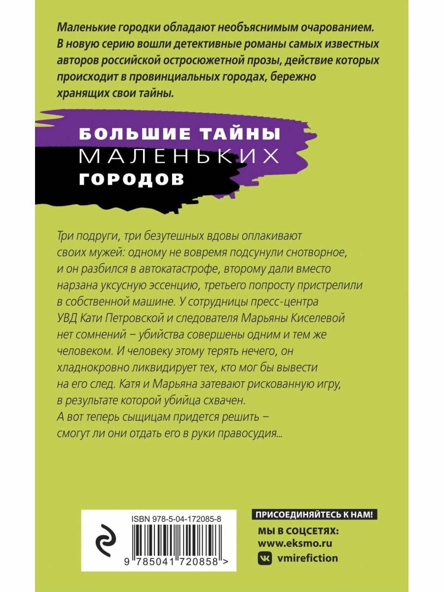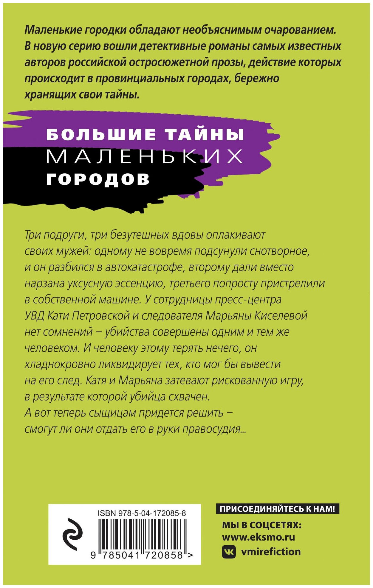 Три подруги, три безутешные вдовы, оплакивают своих мужей: одному не вовремя подсунули снотворное и он разбился в автокатастрофе, второму дали вместо нарзана уксусную эссенцию, третьего попросту пристрелили в собственной машине. У сотрудницы Пресс-центра УВД Кати Петровской и следователя Марьяны Киселевой нет сомнений - убийства совершены одним и тем же человеком. И человеку этому терять нечего, он хладнокровно ликвидирует тех, кто мог бы вывести на его след. Катя и Марьяна затевают рискованную игру, в результате которой убийца схвачен. А вот теперь сыщицам придется решить - смогут ли они отдать его в руки правосудия…
