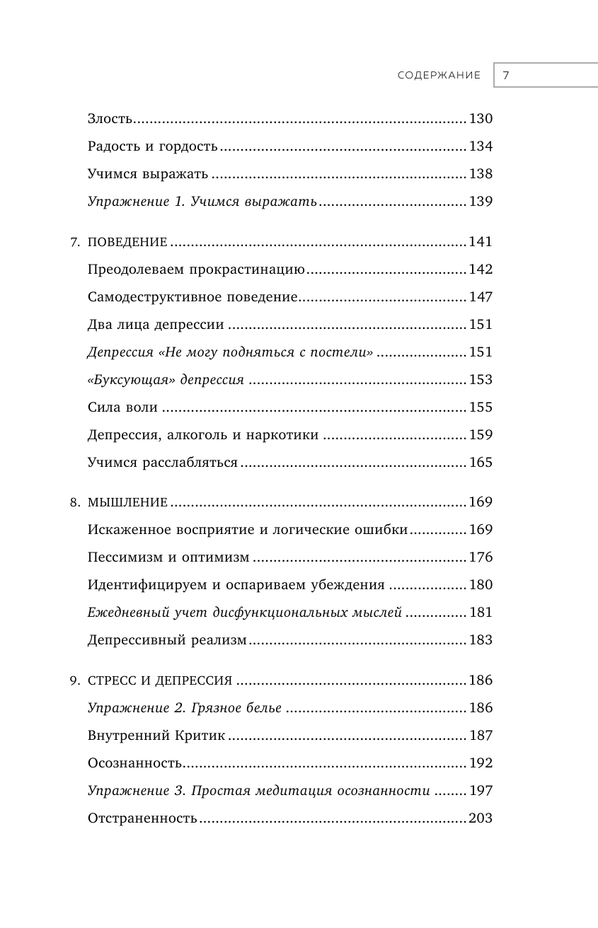 Книга легко читается, я бы назвала её вдохновляющей. Что особенно оказалось полезным, так это журнал настроения, который помог мне выявить то, что я не осознавала и под влиянием чего действовала бездумно, то есть это были бессознательные эмоции. Я поняла удивительную связь между эмоциями, внешними раздражителями и внутренними мыслями, фантазиями и воспоминаниями. Кроме того, всего 10 минут медитации помогают мне прийти в себя, когда я чувствую себя подавленной. Прочитав «Выйти из депрессии» я смогла обрести надежду и уверенность в своей жизни, которые приносят облегчение и успокаивают. Эту книгу стоит прочитать каждому.