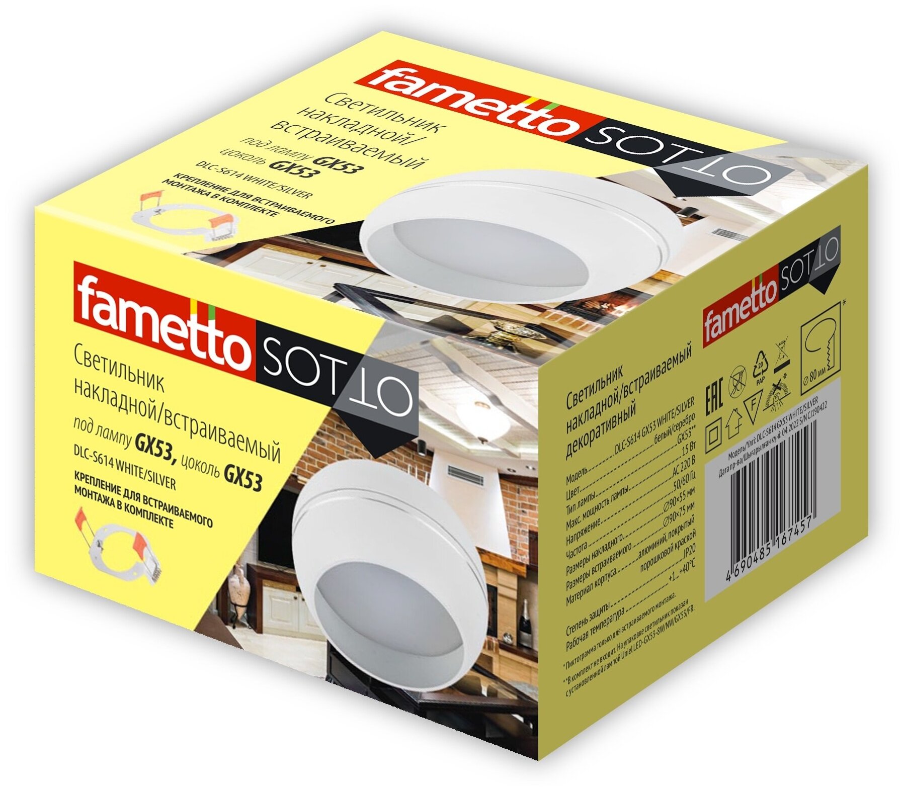 **Светильник точечный встраиваемый/накладной Fametto S614IP20б** используется в качестве дополнительного источника света в помещениях небольшой площади (до 3 м²), а также для создания визуальных зон. Не предназначен для эксплуатации в условиях повышенной влажности или запыленности.