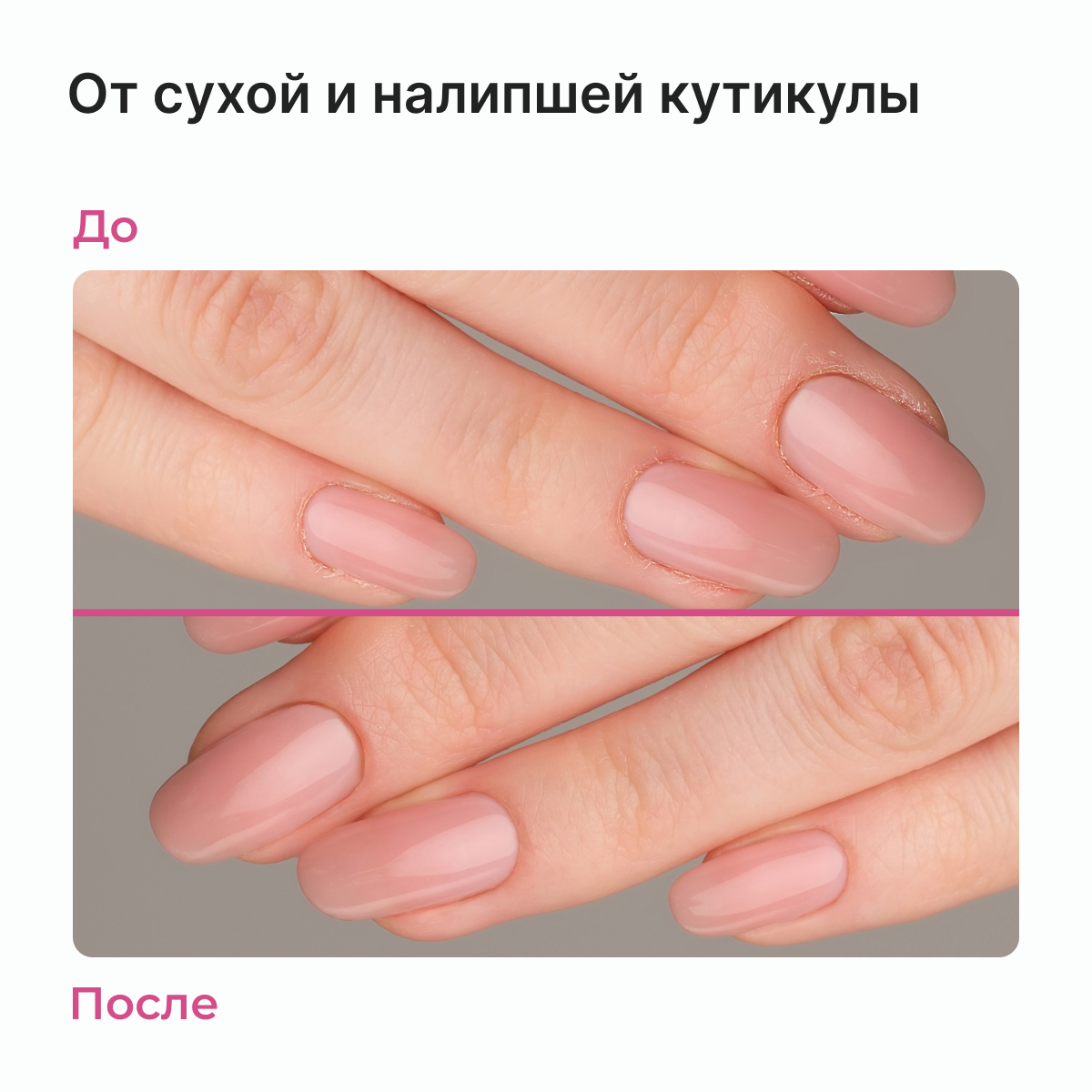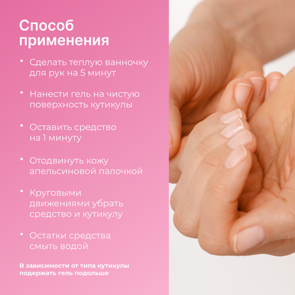 Нанесите на ногти (контур), на чистую поверхность валика кутикулы, дайте впитаться. Через 1 минуту аккуратно отодвиньте и удалите размягченную кутикулу с помощью деревянной маникюрной палочки. После процедуры используйте масло для кутикулы. Затем можно использовать гель или лак для ногтей.