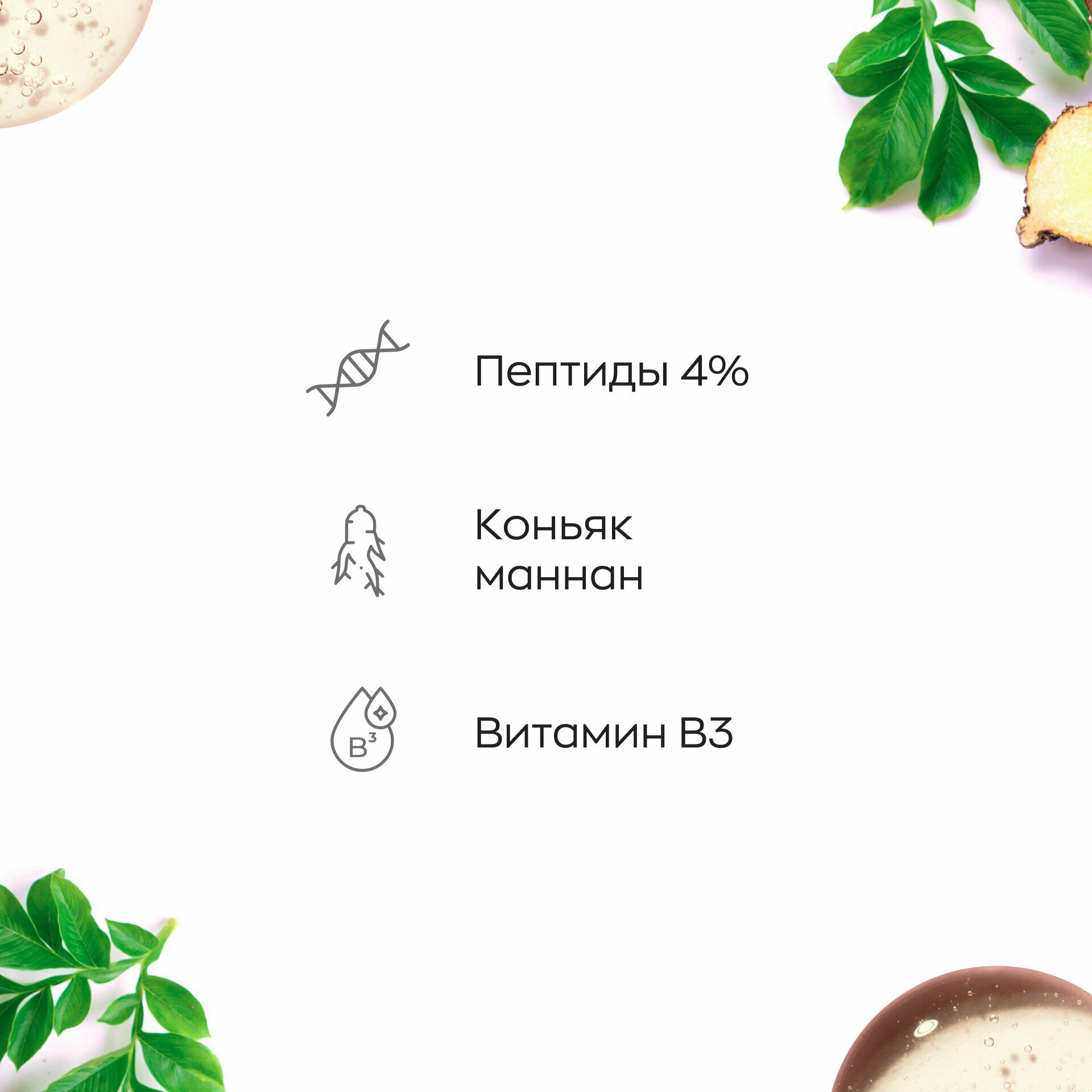 | Активные компоненты | Состав: aqua, dextran, f3acetyl tripeptide-2 (пептиды), glycerin, amorphophallus konjac root extract (коньяка маннан экстракт), hydroxyethylcellulose, ethylhexylglycerin, phenoxyethanol, didecyldimonium chloride, peg-40 hydrogenated castor oil, peg-12 dimethicone, allantoin, niacinamide (витамин в3), disodium edta, parfum. |