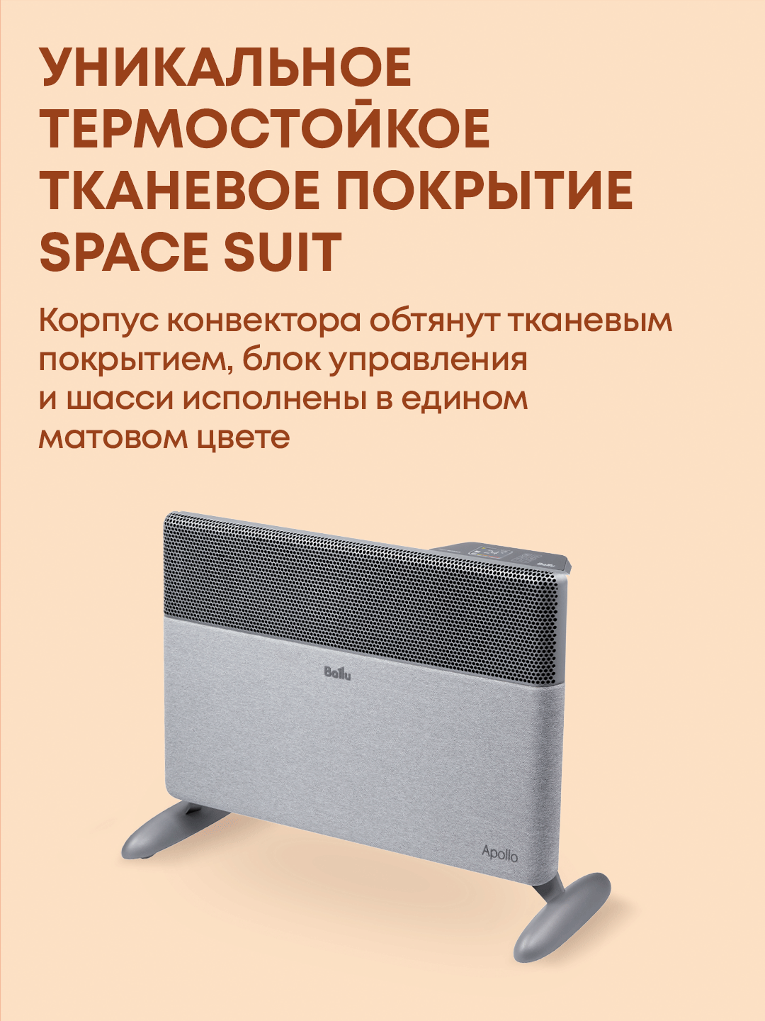 Apollo Digital INVERTER – единственный в мире конвектор с дизайнерским исполнением в износостойкой и огнепрочной ткани. Moon gray – металлический корпус затянут в серую ткань, шасси выкрашены в тот же цвет с глухим матовым блеском.