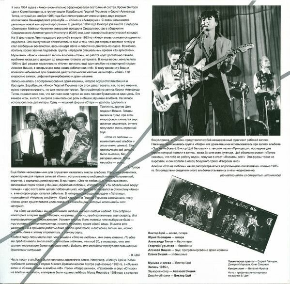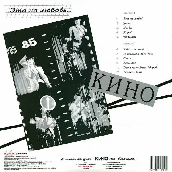 «Это не любовь» — такое название получил четвертый альбом группы «Кино», вышедший в 1985 году. Хотя сами создатели пластинки позже отзывались о ней неоднозначно, альбом подарил нам несколько отличных песен, вроде «Я объявляю свой дом (Безъядерная зона)» и «Дети проходных дворов». В 2012 году случилось виниловое переиздание, тиражом в 1000 экземпляров, компанией Moroz Records. Тираж напечатан в Германии в составе «Коллекции Кино на виниле». Самая популярная рок-группа Советского Союза — «Кино», была основана в 1982 году Алексеем Рыбиным и Виктором Цоем. Последний стал автором почти всей музыки и всех текстов на протяжении существования коллектива, который прекратил свою деятельность в 1990 году после смерти лидера. Группа «Кино» действительно стала легендарной — о ней знает каждый человек на постсоветском пространстве, её композиции звучат в фильмах, сериалах и перепеваются другими коллективами. Во многих городах имеется «стена Цоя», у которой собираются поклонники группы.