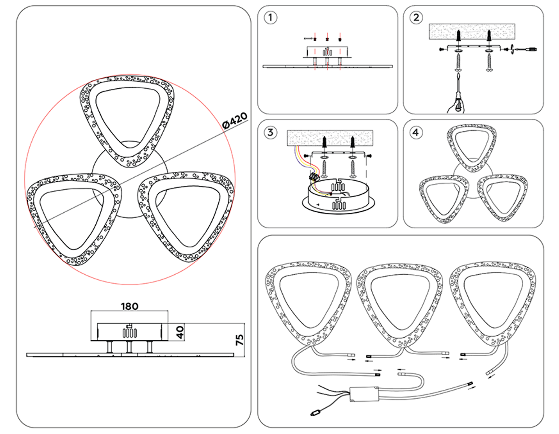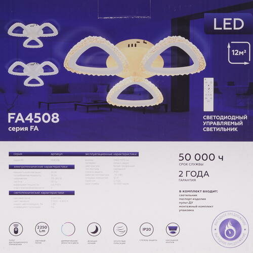 Люстра имеет современный дизайн. Она состоит из четырех светодиодных ламп, которые дают яркий свет. При этом они потребляют минимум электроэнергии. Другие технические параметры модели: