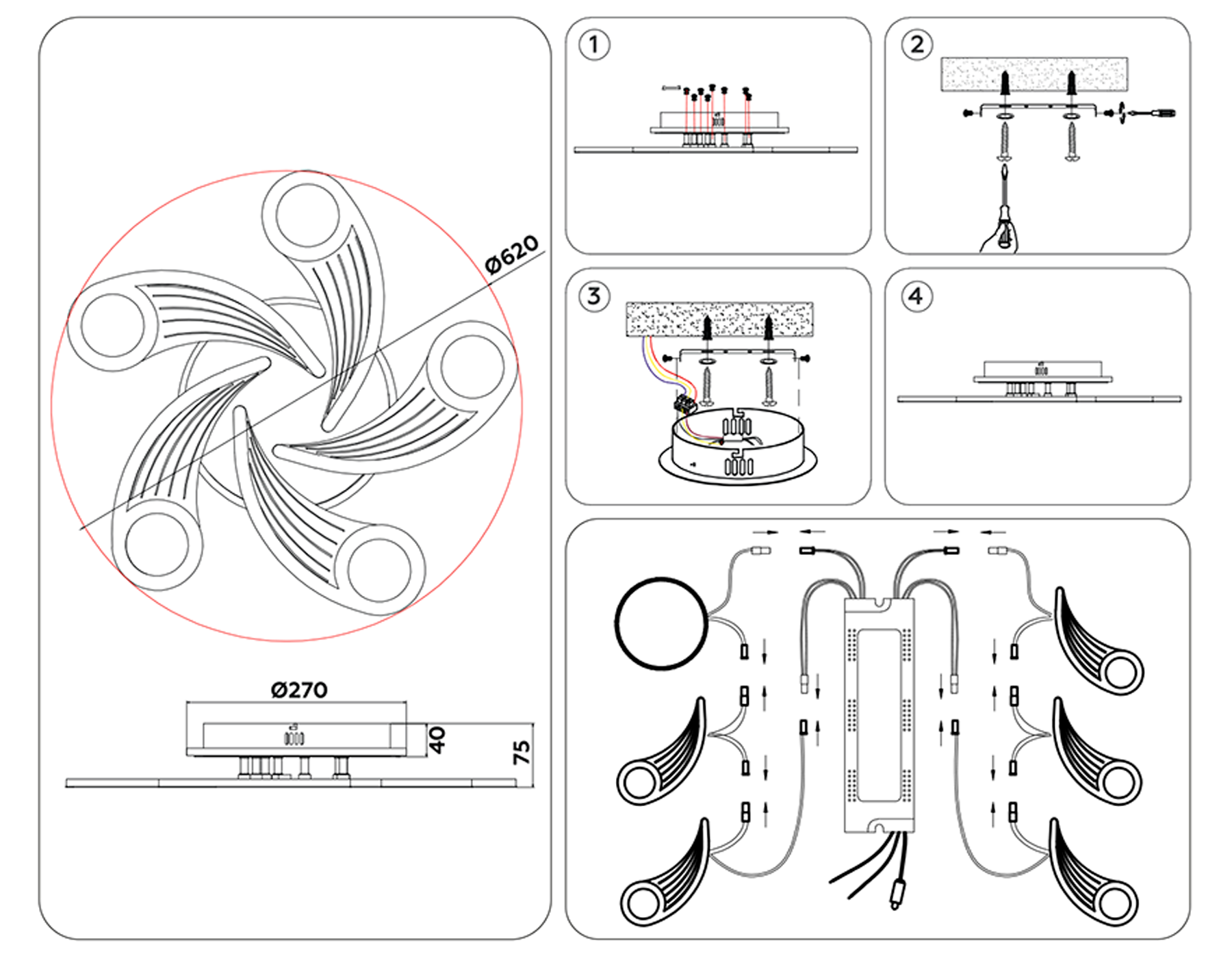 Прибор крепится при помощи специальной монтажной планки. Его размеры составляют 62х75 см, вес – 2,2 кг. Люстра оснащена пультом дистанционного управления, который позволяет регулировать режимы работы устройства.