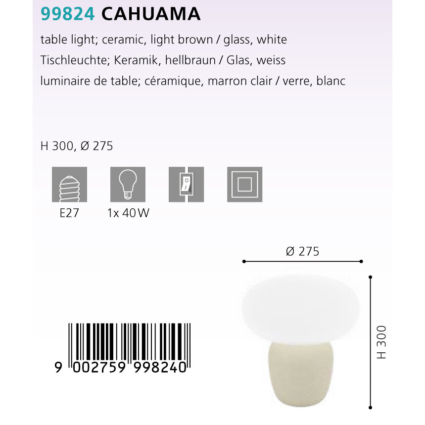 | Номенклатура | 99825 Настольная лампа CAHUAMA, 1х40W, E27, H300, D275, керамика, светло-коричневыйй/стекло, белый |