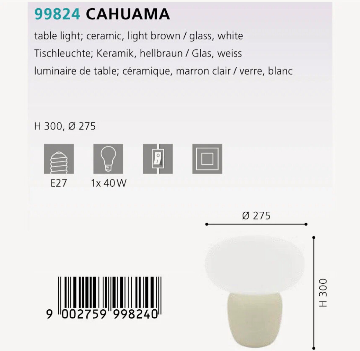 Номенклатура | 99825 Настольная лампа CAHUAMA, 1х40W, E27, H300, D275, керамика, светло-коричневыйй/стекло, белый |