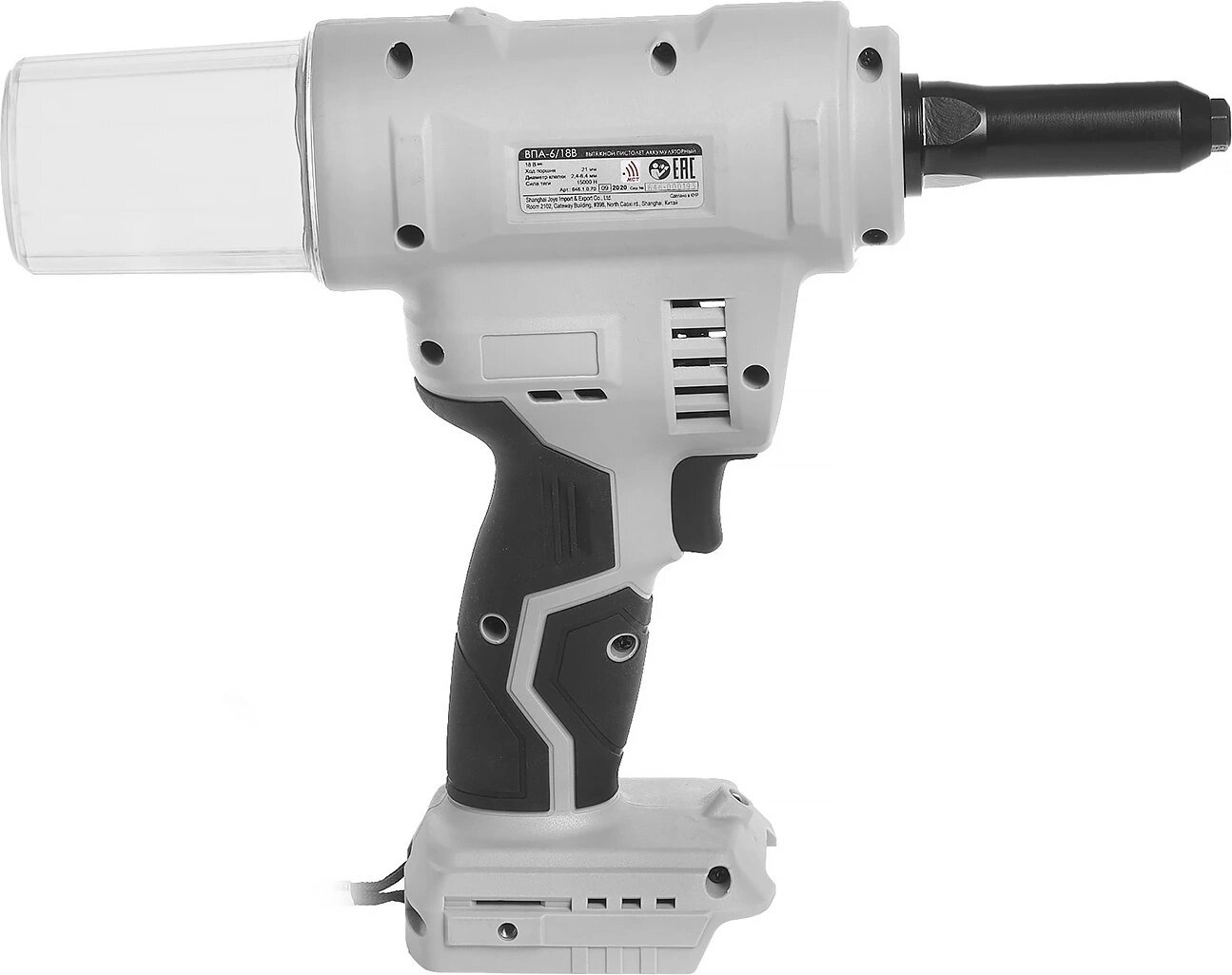 | Прочие особенности и свойства | Вытяжной аккумуляторный пистолет Интерскол ВПА-6/18В 646.1.0.70 применяется для установки вытяжных заклепок размером от 3.2 до 6.4 мм. Благодаря высокому усилию отличается хорошей производительностью и может работать практически с любой расходкой., , Подсветка оптимально освещает рабочую область., , Сбор штоков от заклепок производится в специальную емкость., , Бесщеточный двигатель надежен в эксплуатации и требует минимального обслуживания., , Удлинённый «носик» пистолета облегчает установку заклёпок в труднодоступных местах. |