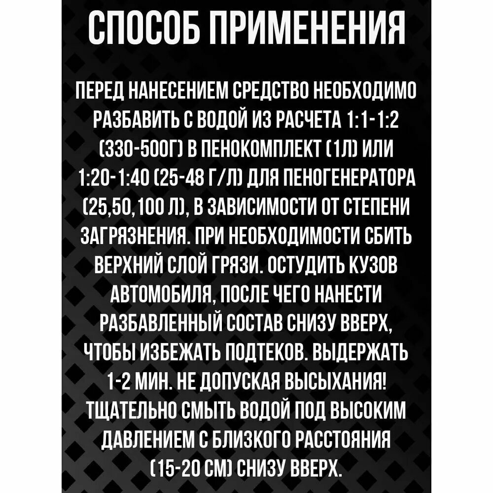 Перед нанесением средство необходимо разбавить с водой из расчета 1:1-1:2 (330-500г) в пенокомплект (1л) или 1:20-1:40 (25-48 г/л) для пеногенератора (25,50,100 л), в зависимости от степени загрязнения. При необходимости сбить верхний слой грязи. Остудить кузов автомобиля, после чего нанести разбавленный состав снизу вверх, чтобы избежать подтеков. Выдержать 1-2 мин. не допуская высыхания! Тщательно смыть водой под высоким давлением с близкого расстояния (15-20 см) снизу вверх.