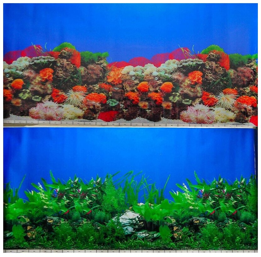 Двусторонний аквариумный метражный фон на ламинированной бумаге с красочными фотографиями подводного мира.