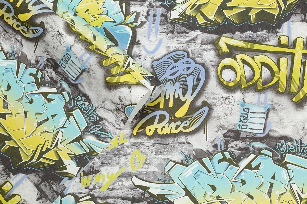 Daim style – новое течение в изображении граффити в виде объемных фигур на стене. Объемные яркие граффити словно выступают вперед и парят над поверхностью стены. На кирпичах нанесен матовый декор с эффектом "шагрень", который создает Мотив обоев имеет «скрытые» граффити, которые нарисованы светящейся пастой и видны только в темноте. тактильно шероховатую натуральную поверхность.