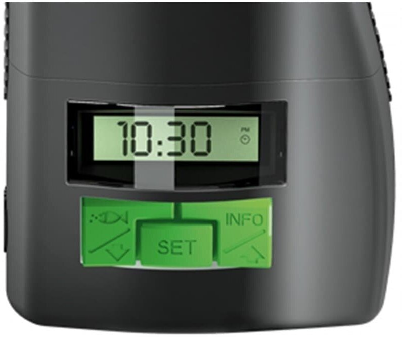 | Дополнительно | Уникальная технология тройной защиты. До 3 кормлений в день, с возможностью установки различного количества корма. Возможность покормить при помощи нажатия кнопки. Подходит для большинства типов корма. Цифровой дисплей. Универсальная установка на различных типах аквариумов. |