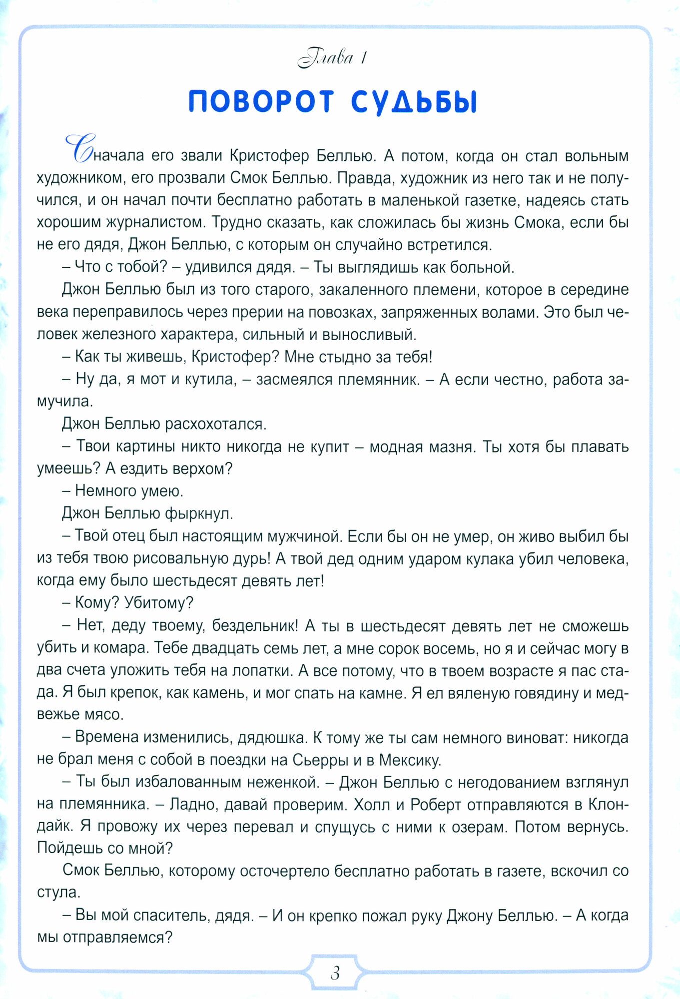 Перед читателями предстаёт удивительный , но крайне опасный мир сурового Севера с его гонками на собачьих упряжках, золотыми приисками Клондайка и безумными приключениями. Именно сюда, на Аляску, отправляется Смок, чтобы попытать счастья в поисках золота. Невероятный оптимизм повествования, особый позитивный взгляд, наполненный романтикой, буквально захватывают с первых страниц. Именно эти качества произведения привлекают подростков, а не суровая реальность. А адаптированный пересказ произведения побуждает к прочтению оригинала.