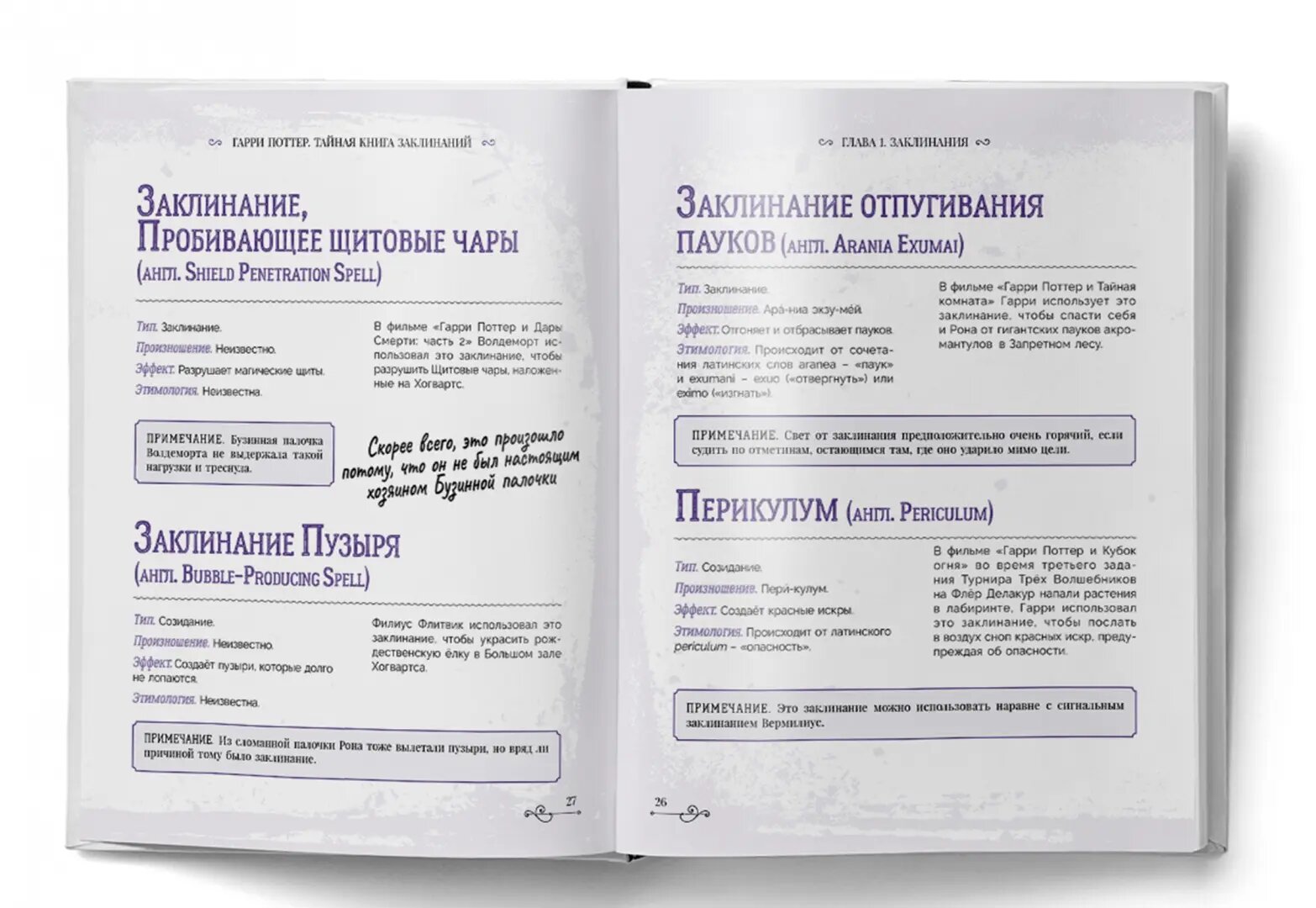 Каждое заклинание подробно описывается - его тип, произношение, эффект, этимология, движение палочкой, а также упоминается где использовалось данное заклинание и есть примечание с дополнительной интересной информацией.