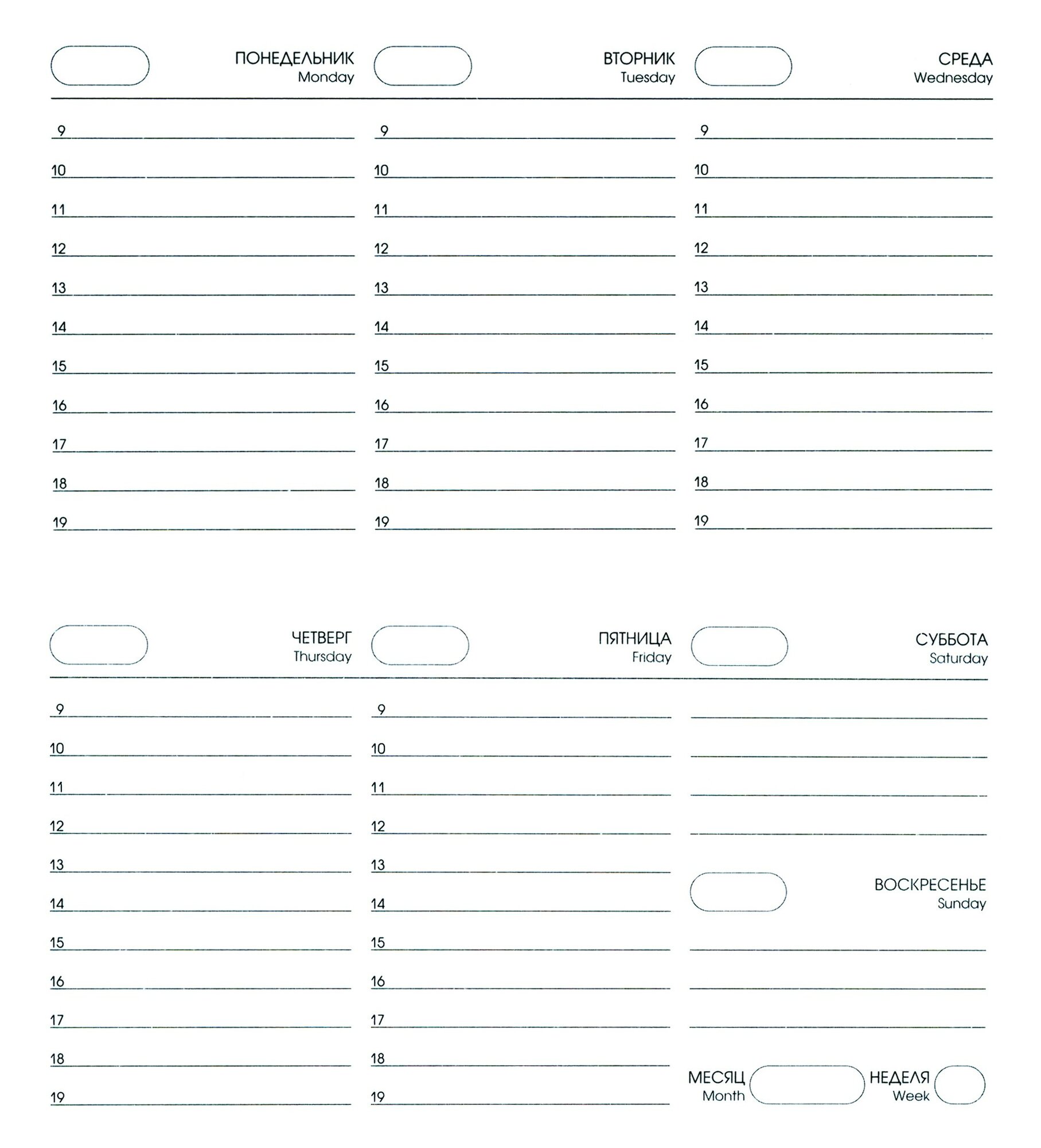 Вся необходимая информация находится под рукой, все дни недели расположены на одном листе, а это значит, что все ваши планы и записи находятся всегда перед глазами.