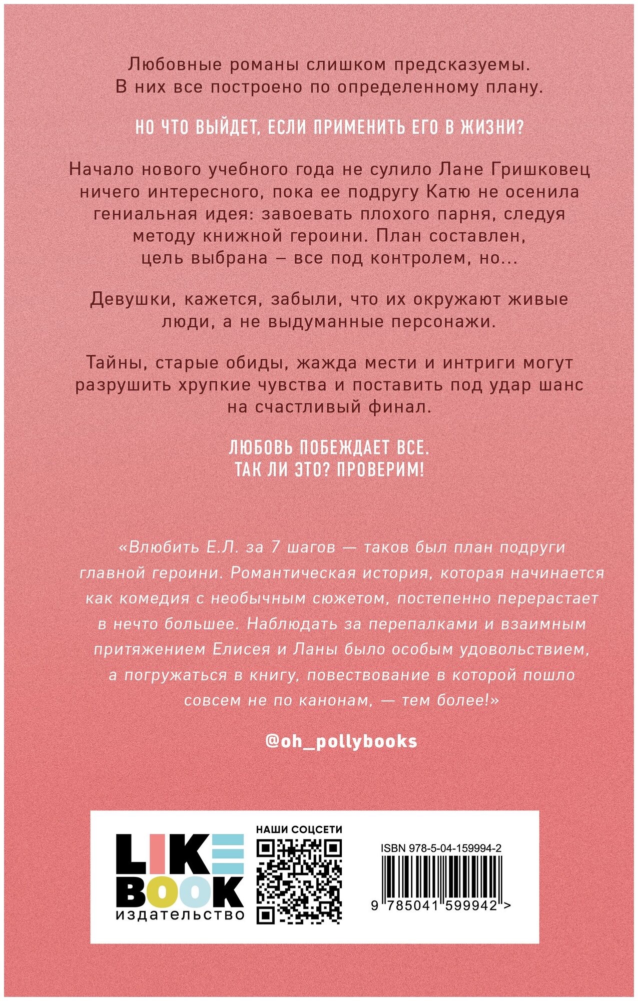 "Влюбить Е.Л. за 7 шагов - таков был план подруги главной героини. Романтическая история, которая начинается как комедия с необычным сюжетом, постепенно перерастает в нечто большее. Наблюдать за перепалками и взаимным притяжением Елисея и Ланы было особым удовольствием, а погружаться в книгу, повествование в которой пошло совсем не по канонам, - тем более!" - @oh_pollybooks