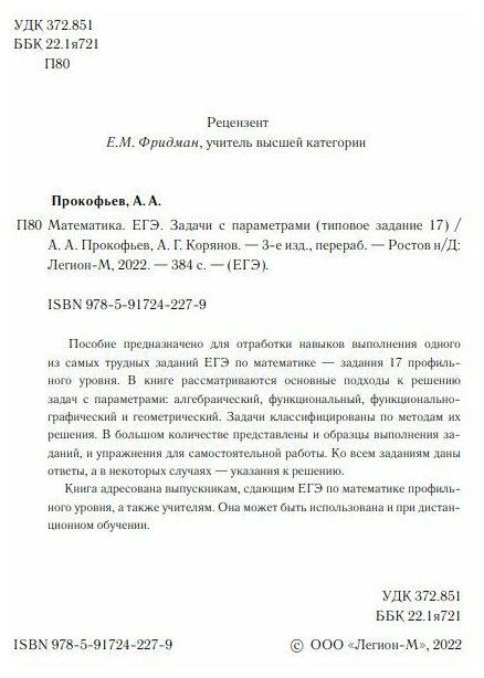 Сервис сравнения цен СкидкаГИД предлагает сравнить цены на товар «Книга: Математика ЕГЭ Задачи с параметрами типовое задание 17 (Прокофьев Александр Александрович; Корянов Анатолий Георгиевич); Легион, 2023»