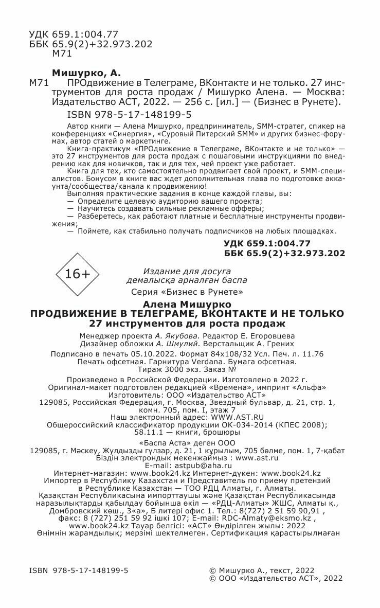 ПРОдвижение в Телеграме ВКонтакте и не только. 27 инструментов для роста продаж (Алена Мишурко); Издательство АСТ, 2022