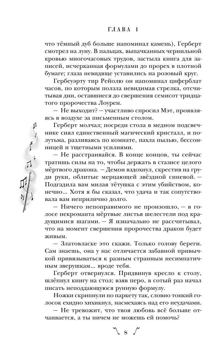 Главные герои меня покорили ещё в первой части, но в этой я полюбила Кейлуса и его музыку, читая книгу я словно чувствовала то, что он хотел сказать, но не сумел.