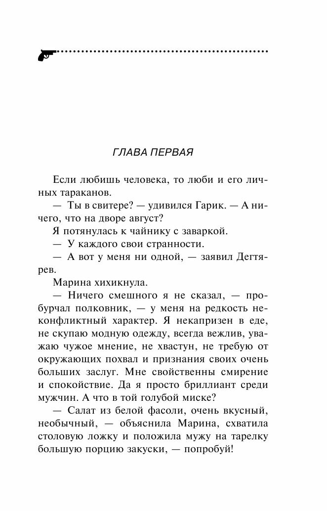 Если любишь человека, то люби и его личных тараканов. Даша Васильева давно живет по этому правилу, а вот жена полковника Дегтярева Марина — нет. В этот раз он зашел слишком далеко: своими капризами сильно обидел свою вторую половину. Даша попыталась помирить пару, но этому помешала новая клиентка детективного агентства Людмила Косина. Она попросила подтвердить свои подозрения в отношении убийцы ее сестры Надежды Бовари. Врачи заявили, что женщина умерла от инсульта. Однако нанятый Косиной суперэксперт обнаружил, что Бовари была отравлена ядом экзотической гусеницы. И вот этот же яд был обнаружен в креме, который накануне подарила покойной… первая жена Надиного мужа Ольга! Плевое дело, преступник почти найден. Сыщики с энтузиазмом взялись за работу. Тем сильнее был шок, когда они поняли, что все время шли по ложному следу!