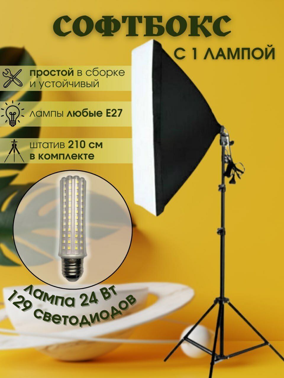 С помощью софта Вы сможете легко улучшить картинку на фото или видео. Софтбокс состоит из: светоотражающего софтбокса 50х70см; держателя для лампы с цоколем E27 и выключателем лампы на проводе; чехол. Имеет мягкий рассеиватель. Благодаря прямоугольной форме и конструкции каркаса в виде зонта, софтбокс имитирует естественное освещение. Синтетическая ткань на софтбоксе в качестве светоотражающей поверхности с высоким коэффициентом отражения. Подходит для создания источника постоянного света для видео!Великолепное качество видео/фото доступно всем!Мощный поток света дает возможность снимать в темном помещении, и дает классную картинку!Размер: софтбокс 50*70см, штатив от 75см – 210смКомплект:Усиленный штатив 78-210смСветодиодная лампа 24вт 5000кСофтбоксРассеиватель
