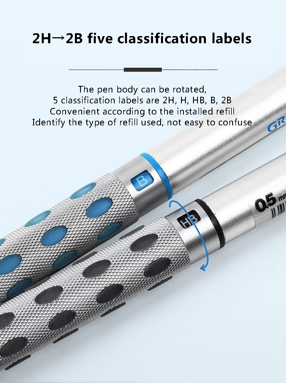 Художникам, инженерам, архитекторам, студентам технических ВУЗов и всем тем, кто ежедневно рисует или выполняет графические и чертежные работы, придется по душе стильный металлический корпус GraphGear 1000 с эргономичной зоной захвата, оснащенной специальными силиконовыми точками, уникальным поворотным индикатором твердости и точной (строго по 2 мм) системой подачи грифеля.