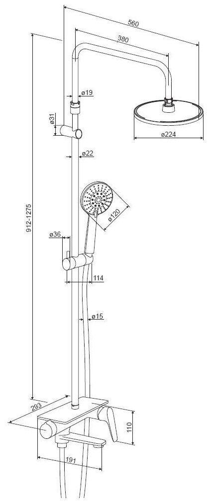 | Высота душевой шт.анги | 91.2-127.5 см |