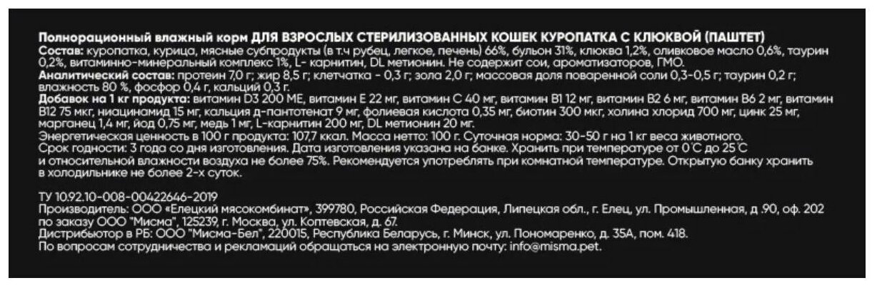 Состав: куропатка 15%, курица 20%, мясные субпродукты 31% (рубец, легкое, печень), бульон 31%, клюква 1,2%, оливковое масло 0,6%, таурин 0,2%, витаминно-минеральный комплекс 1%, L- карнитин, DL метионин.