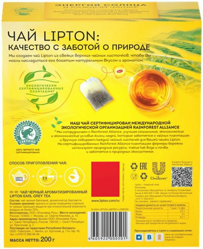 Чай Lipton Yellow Label черный байховый 100 пакетиков — отличный чай высокого качества, созданный из нежных чайных лепестков и их выжимки. Уникальная технология производства, специальный сбор и бережное отношение к сушке, фасовке и транспортировке с непрерывным контролем всех процессов, позволяют получить отменный результат, который покоряет множество поклонников бодрящего напитка. Черный байховый чай — непременный атрибут доброго утра, а также приятного обеда и теплых вечеров. Сложно представить свои будни без чашки тонизирующего напитка. И неважно, чем наполнен день — домашними хлопотами или трудными отчетами, — крепкий, горячий чай согреет, взбодрит, утолит жажду и поднимет настроение. Чай Lipton Yellow Label готовится очень просто. Достаточно заварить чайный пакетик кипятком и буквально через пару минут он раскроет свой богатый и натуральный вкус, окружит вас ярким ароматом и наполнит энергией. Черный чай идеально сочетается с различными бутербродами, легкими закусками, а также нежными и сладкими десертами. Он станет прекрасным сопровождением встреч, совещаний, различных мероприятий и праздничных моментов. А большой упаковки хватит на множество ярких мгновений, проведенных с дорогими и близкими людьми. Состав: чай черный байховый высшего сорта. Способ приготовления: заварить чайный пакетик в чашке или заварочном чайнике кипяченой водой и настоять 2-3 минуты. Вес: 200 г. Количество пакетиков в упаковке: 100 штук по 2 г. Тип упаковки: картонная коробка. Условия хранения: хранить в чистом, хорошо вентилируемом помещении без посторонних запахов при относительной влажности воздуха не более 70%. Страна производства: Россия.