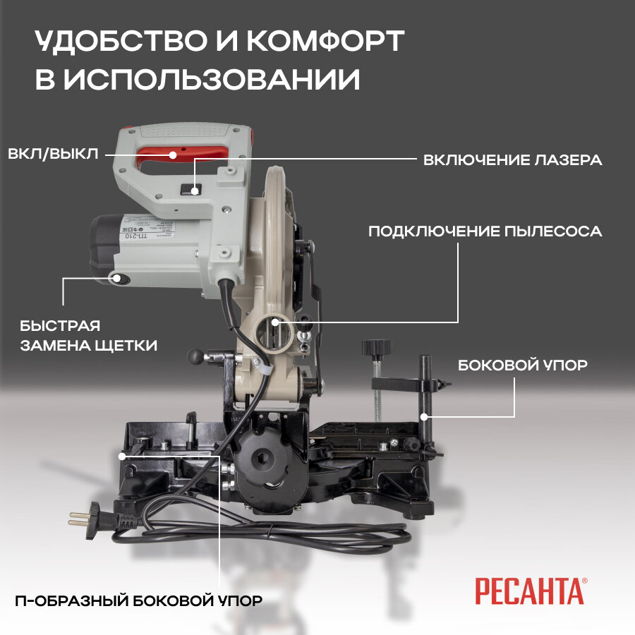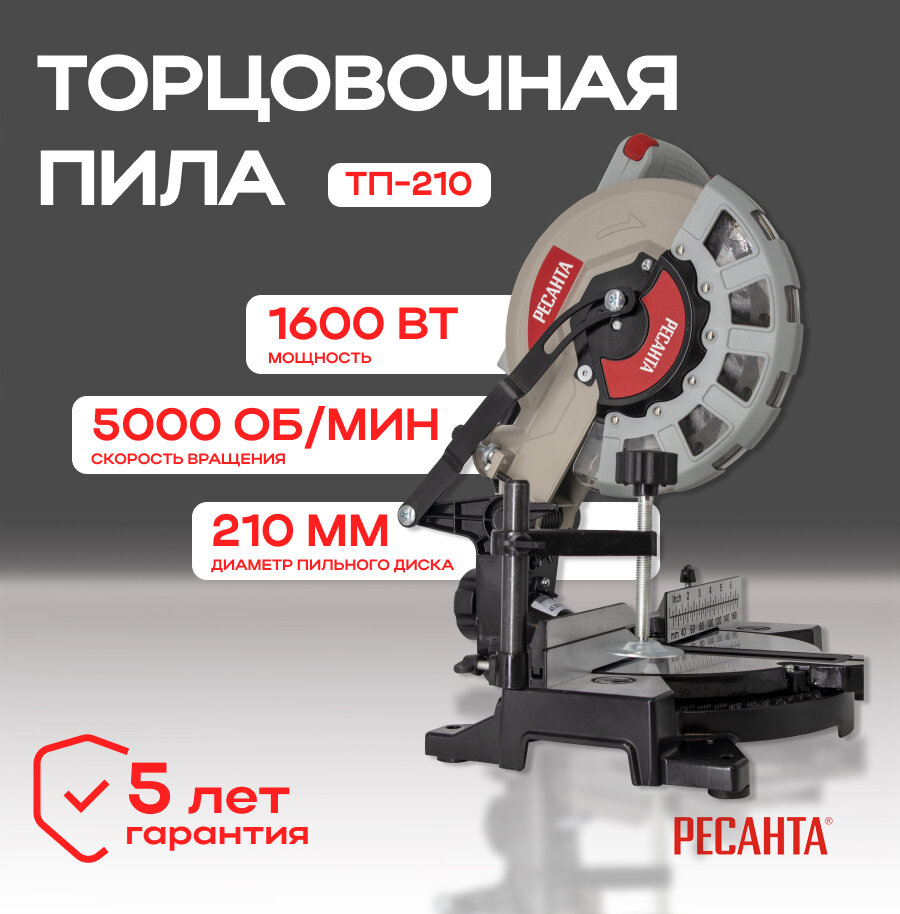 Торцовочная пила Ресанта ТП-210, мощность 1600Вт, диаметр пильного диска 210мм