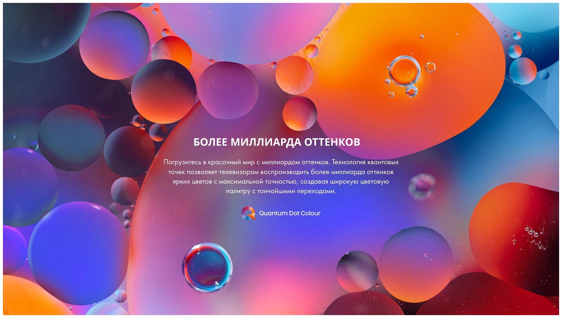 Погрузитесь в красочный мир с миллиардом оттенков. Технология квантовых точек позволяет телевизорам воспроизводить более миллиарда оттенков ярких цветов с максимальной точностью, создавая широкую цветовую палитру с тончайшими переходами.