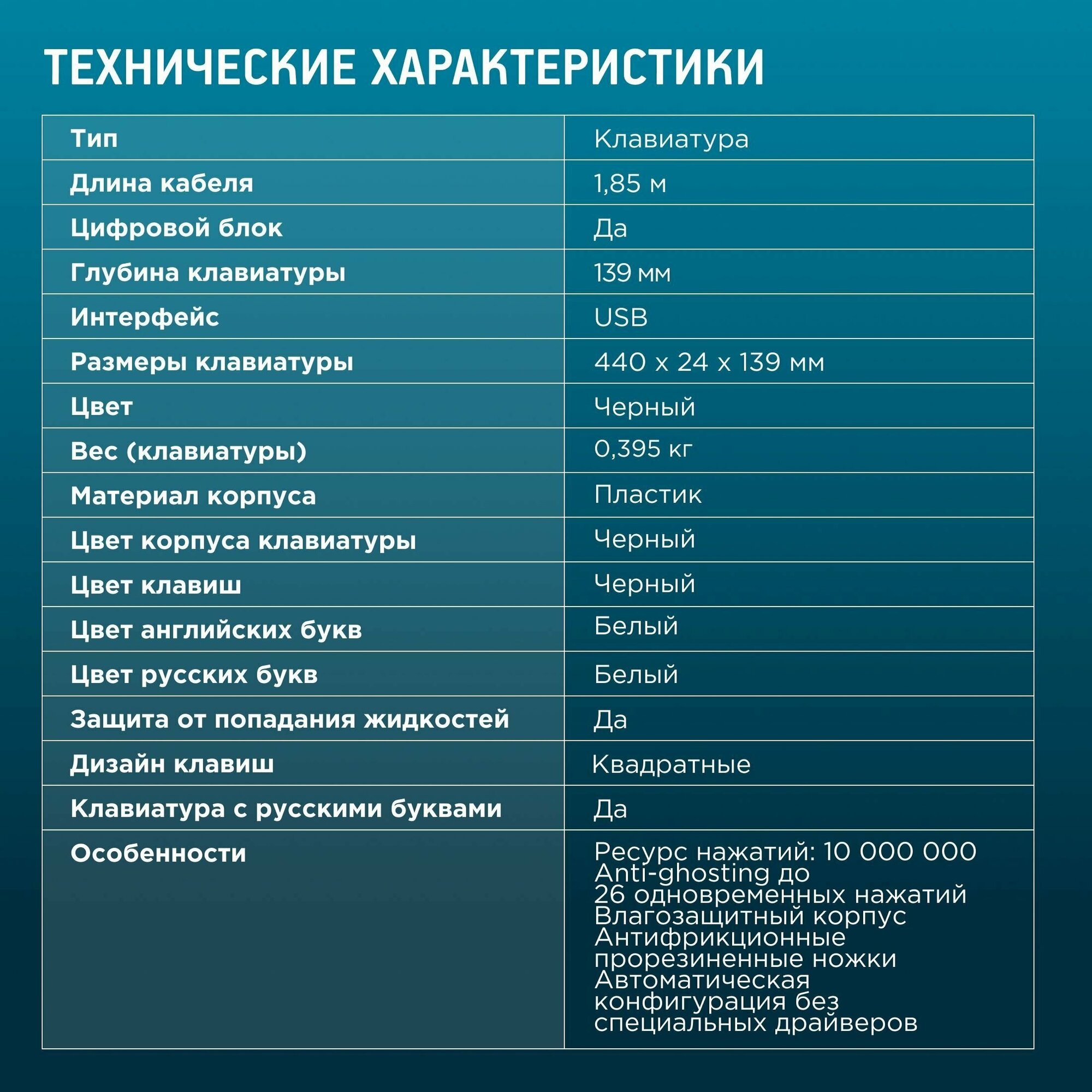 | Особенности | Ресурс нажатий:10 000 000/ Anti-ghosting до 26 одновременных нажатий.Влагозащитный корпус.Автоматическая конфигурация без специальных драйверов. |