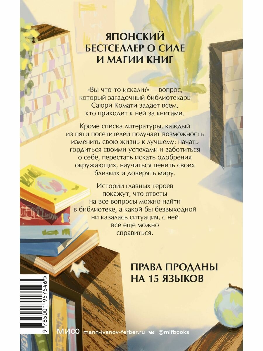 "Вы что-то искали?" - вопрос, который загадочный библиотекарь Саюри Комати задает всем, кто приходит к ней за книгами. Кроме списка литературы, каждый из пяти посетителей получает возможность изменить свою жизнь к лучшему: начать гордиться своими успехами и заботиться о себе, перестать искать одобрения окружающих, научиться ценить своих близких и доверять миру. Истории главных героев покажут, что ответы на все вопросы можно найти в библиотеке, а какой бы безвыходной ни казалась ситуация, с ней все еще можно справиться.