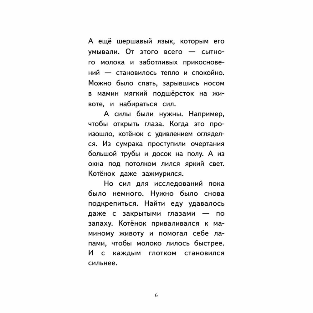 Книга отлично подойдет для самостоятельного чтения ребенка, текст легкий, а печать крупная и четкая. Если, конечно, ребенок выдержит все переплетения судьбы нашего героя кота Лео. Если что, все заканчивается хорошо. Просто непоседа кот постоянно держит читателя в напряжении, потому что рискует, шкодит, убегает, теряется и так далее. В целом, отличная добрая книга, грустное начало, но про котят и щенят, и вообще про друзей наших меньших, всегда грустно в какой то момент истории. Сцена про маму кошку и котят в подвале сменяется историей про одного главного котенка, про остальных ничего неизвестно. Да и он сам немало мок под дождем, голодал и встречал самых разных людей на своем пути в течении рассказа. Но главное все же нашел дом с самой любящей маленькой хозяйкой. Было бы прекрасно, если бы еще чему то научился в конце. Сама книга небольшая, в твердом переплете, как я уже говорила, печать четкая и крупная, есть черно белые картинки.