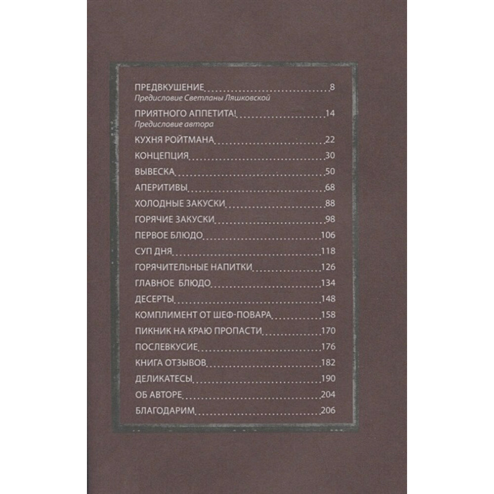 Это - самая провокативная книга по психологии от самого неоднозначного психолога. Вся "кухня" психотерапевта - концепция, методики, этапы работы в индивидуальных и семейных сессиях - изложены последовательно и аргументированно, и одновременно - живо и динамично. Текст изобилует точными портретами и остроумными поворотами, характерными для "ехидного психолога". Рассмотрены примеры использования целого спектра психотехник, которые применяются в практике одного из наиболее ярких и результативных современных психотерапевтов - Александра Ройтмана. Книга написана по мотивам цикла "Мастерских Ройтмана" и предназначена для психологов, психотерапевтов, людей помогающих профессий, а также широкого круга интересующихся и тех, кто видит в психологии способ осознания себя, изменения качества жизни и поддержки в нестабильном пространстве-времени. Для коннотации с "кухней" каждый раздел книги предваряется комментарием концептуального ресторатора Вячеслава Ланкина, совладельца московского ресторана "Деликатесы", удостоенного звезды Мишлена.