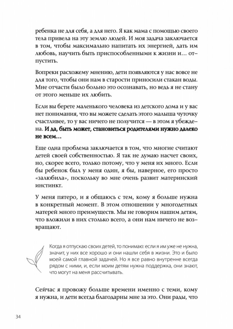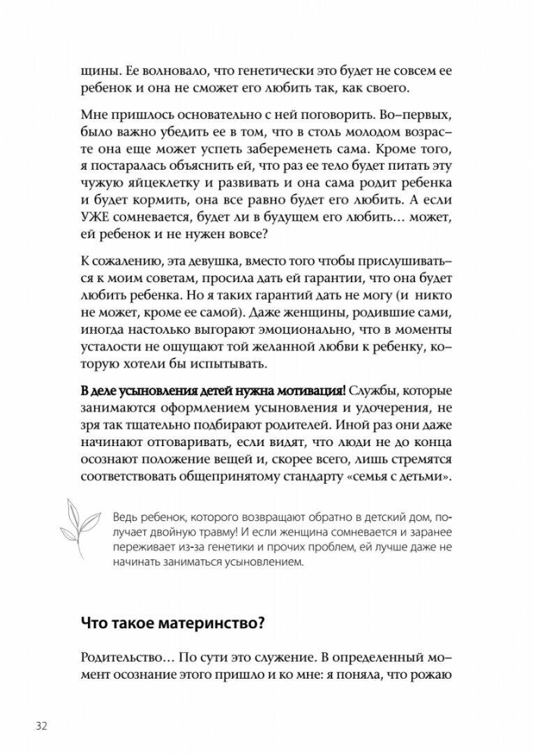 Не согласна с положительными отзывами. Книга исключительно сумбурно написана. Названия глав не соответствуют смыслу. Весь текст из отдельных кусков, местами повторяющихся по смыслу. В целом позиция автора мне импонирует: осознанное материнство, "природные" роды, формирование привязанности. Но, к сожалению, уровень компетенции автора местами вызывает сомнение. И мне не близок упор на медитацию.