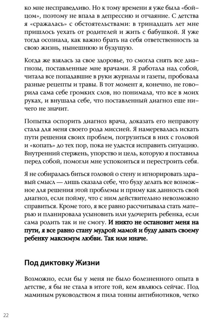 Отличное пособие как для будущих и новоиспеченных мам, так и для мам с опытом. Автор - мать пятерых детей, и ей, будучи героиней с таким большим опытом, точно есть что рассказать. Беременность и материнство часто недооценивают, по-моему, так же часто для многих это является на уровне катастрофы, однако это естественно и прекрасно, но и недооценивать это нельзя. Эта книга только по своему оглавлению рождает желание поставить памятник каждой матери. Ладно. Не хочу быть грубой, но родить - меньшее из материнства. Материнство - период, растягивающийся на всю жизнь женщины, начиная с зачатия. Автор и начинает с этого и даже раньше - с подготовки к беременности. Надо сказать, что автор больше опирается на духовную часть материнства, и подготавливает женщину морально, направляя ее на нужную волну, на нужное настроение, акцентируя внимание в своих вопросах по ходу текста на самоощущение читательницы. Поэтому перед вами чистая психология. Дело в том, что даже во время беременности бОльшая часть ее прохождения зависит от внутреннего баланса, точнее от стремления его удержать, от ощущения безопасности и целостности, "не переживайте, мамочка" - говорит доктор. Как я уже сказала, роды - не так "страшно", как следующий месяц, два и год. Это следующая, третья глава после подготовки к беременности и родам. На мой взгляд, там кроется главная мудрость от женщины, которая вырастила 5 детей, а именно то, как не потерять себя. Самая хорошая мама - отдохнувшая мама. Думаю, этим все сказано. И именно этим женщинам, которые родили и растят еще одну или несколько личностей, не забывая про свою, заслуживают самый настоящий орден героини.