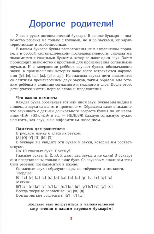 В данной книге буквы расположены в особой «логопедической» последовательности: сначала ребёнок изучает гласные буквы, которые дают один звук, затем – простые для произнесения согласные звуки, после – буквы, обозначающие звуки, в произношении которых чаще всего встречаются нарушения ([с], [з], [ш], [ж], [р] и др.). Благодаря работе с букварём формируется навык звукового анализа и синтеза, развиваются фонематический слух, зрительное восприятие, мышление и внимание, пространственное ориентирование, графомоторные навыки, обогащается словарный запас, развивается речь.