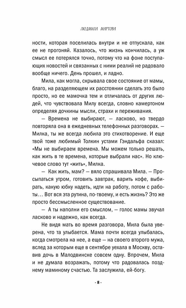 Очередная достойная новинка от автора! Персонажи Людмилы Мартовой всегда живые, настоящие люди со своими небольшими и личными проблемами. Я проникаюсь ее прозой, чувствую себя друзьями с ее героями. Детективная составляющая романов тоже всегда на высоте: я до последнего не знала, как развернется история. Браво!