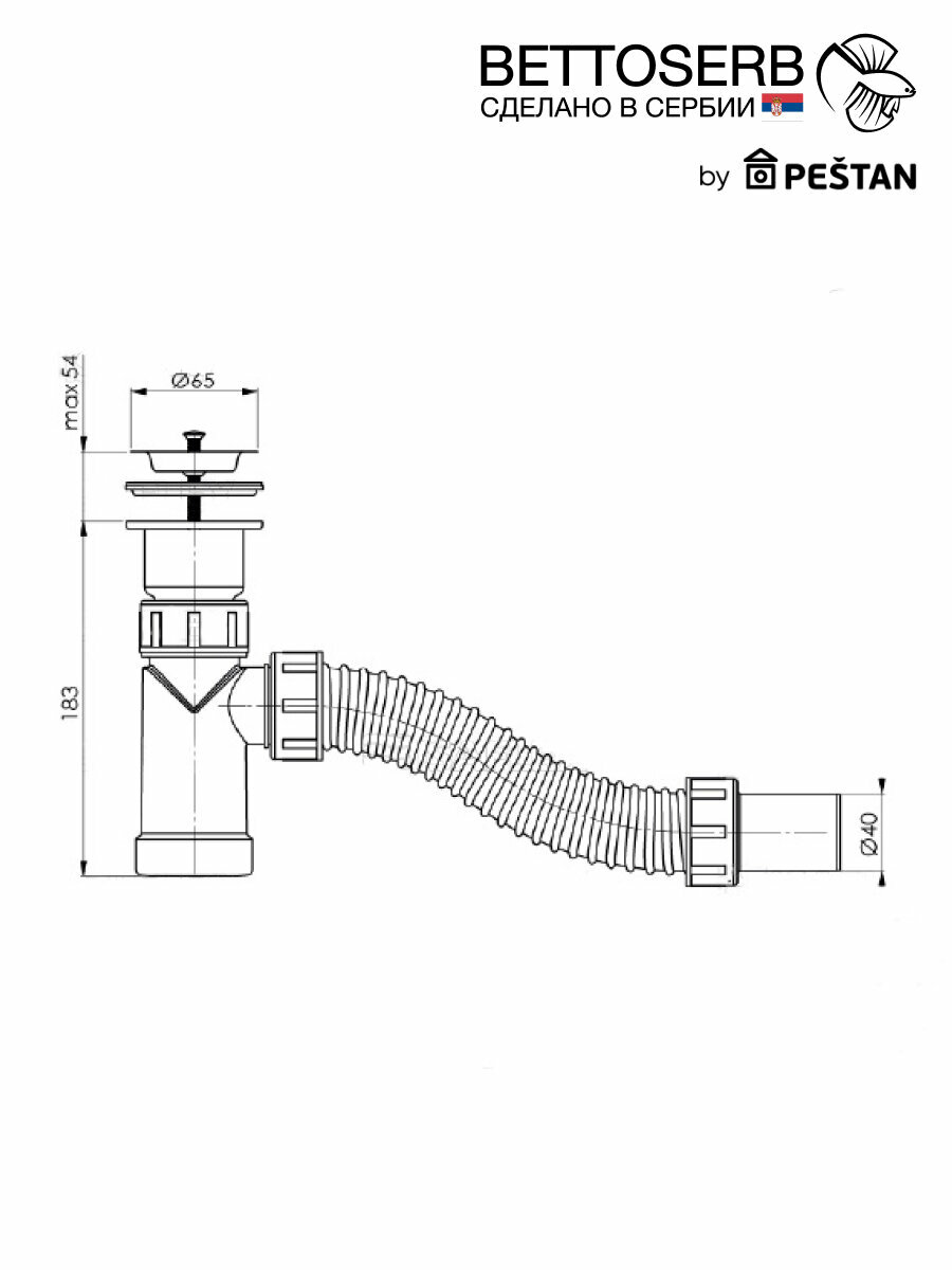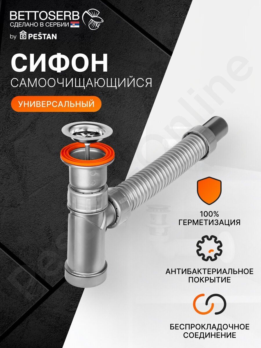 Сифон для раковины BETTOSERB из нержавеющей стали, полипропилена и поливинилхлорида. Обладает встроенным гидрозатвором высотой 34 мм и силиконовой мембраной. Имеет коническое соединение с гибким шлангом, что обеспечивает надежное уплотнение и предотвращает выпадение шланга. Уплотнитель обеспечивает надежную герметизацию сифона и раковины. Длина шланга 250 мм. Пропускная способность 30 литров в минуту. Диаметр решетки 65 мм. Быстрый монтаж - в течении 5 минут. Срок службы не менее 50 лет и 100% гарантия от протечек.