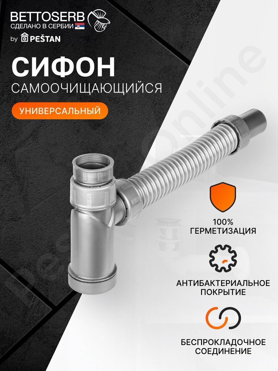 Сифон для раковины BETTOSERB из полипропилена и поливинилхлорида. Обладает встроенным гидрозатвором высотой 34 мм и силиконовой мембраной. Имеет коническое соединение с гибким шлангом, что обеспечивает надежное уплотнение и предотвращает выпадение шланга. Оснащен самоочищающейся гофрой - SelfCleaning. Длина шланга 250 мм. Пропускная способность 30 литров в минуту. Быстрый монтаж - в течении 5 минут. Срок службы не менее 50 лет и 100% гарантия от протечек.