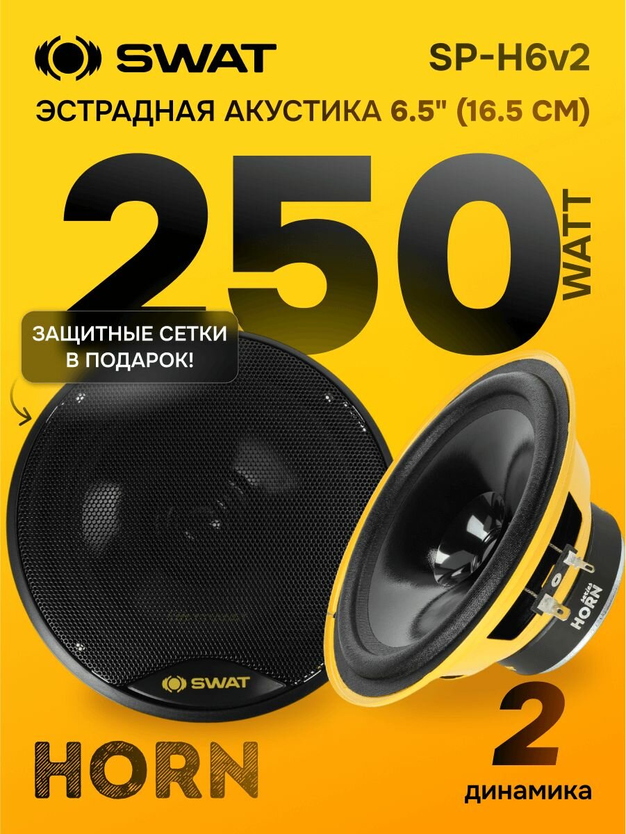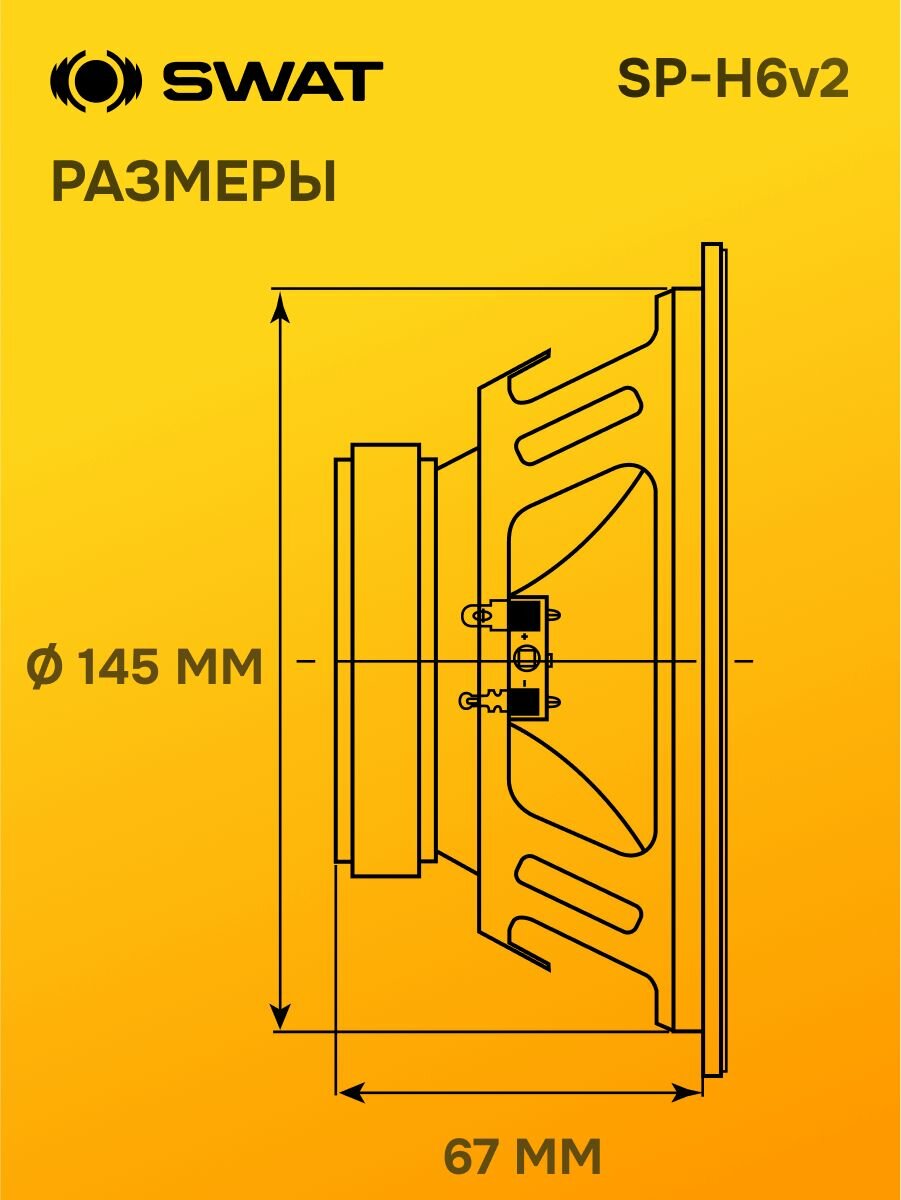 Размер звуковой катушки 1 дюйм. Это основной параметр, от которого зависит мощность акустики. Здесь катушка нормального для бюджетных широкополосников размера. Раскрыть потенциал эту акустику можно усилителем с номиналом 80 - 100 Вт. Импеданс акустики Swat SP-H6 составляет 4 Ома. Это позволит вам соединять их до четырех штук параллельно и подключать к усилителям и широкополосным моноблокам класса D с допуском 1 Ом или по две штуки в параллель и подключать к моноблокам и усилителям класса AB с допуском в 2 Ома. Нижняя граница рабочего диапазона акустики составляет Swat SP-H6 - 80 Гц Это позволяет использовать эти динамики как полноценную фронтальную или тыловую эстрадную акустику. Монтажная глубина - важный параметр. Он определяет особенности компоновки и монтажа динамиков. Посадочная глубина Swat SP-H6 равна 60 мм Это достаточно плоские динамики. С их установкой не должно возникать каких-либо проблем