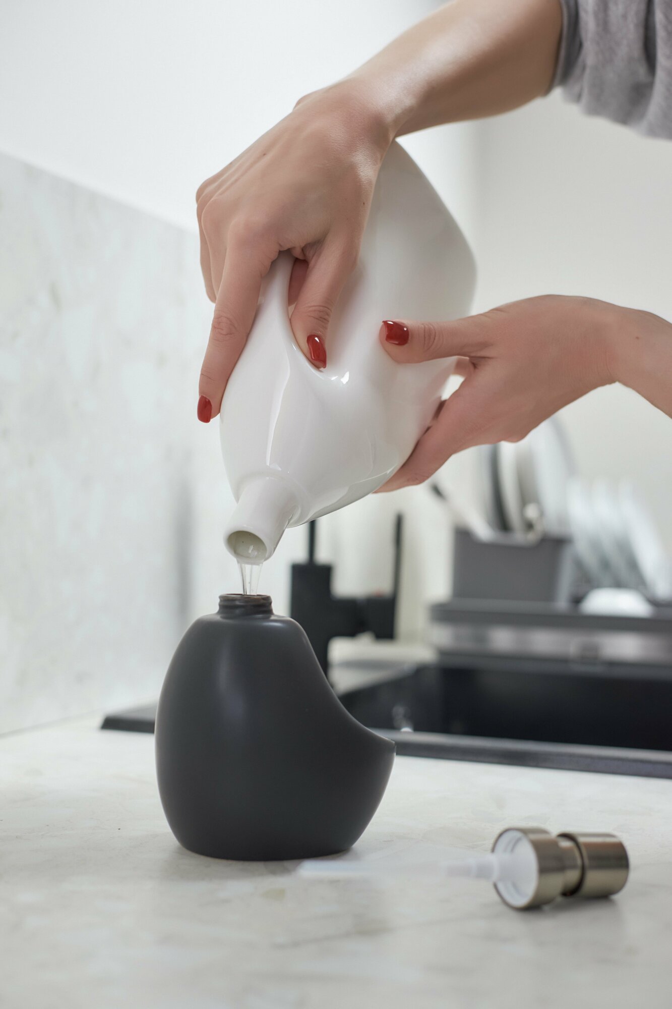 Диспенсер работает от 4-х батареек типа ААА, которые вставляются в нижней части устройства. Мигающий индикатор сообщает о низком уровне заряда и о необходимости замены источника питания. Жидкость добавляется через верхнюю часть корпуса. Одна порция мыла приблизительно равна 1 мл. Для увеличения дозировки необходимо подержать руки под датчиком около 2 секунд. Оптимальное расстояние от рук до сенсора – 5 см.