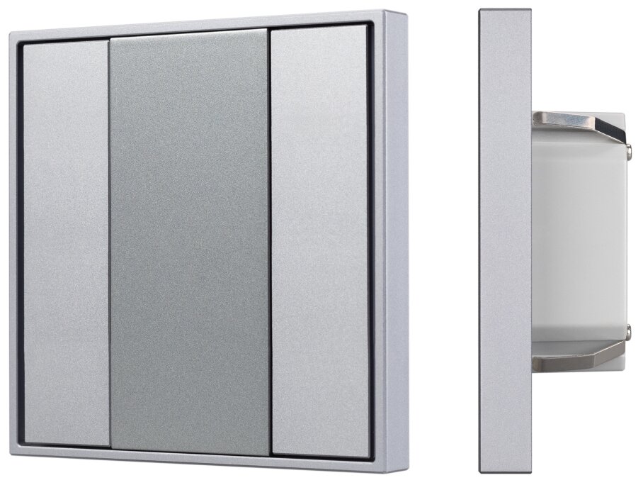 Универсальная встраиваемая настенная панель стандарта KNX. 2 кнопки, цвет корпуса и кнопок серый. Питание от шины KNX DC 21-30V. Безрамочный дизайн. 80х80х9