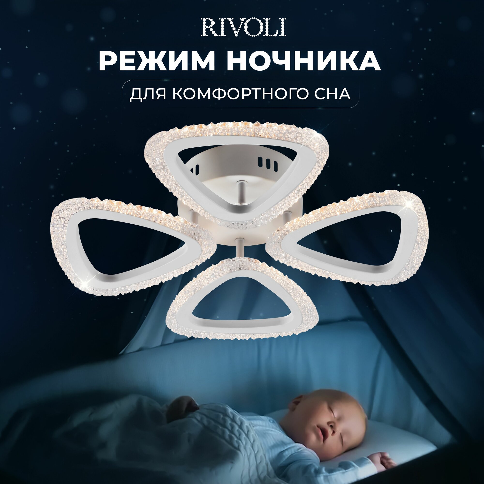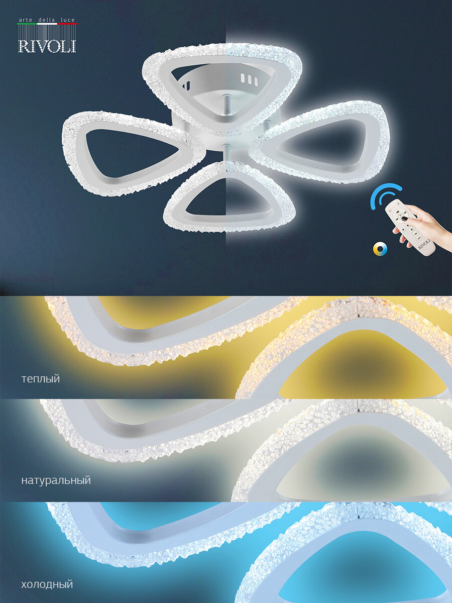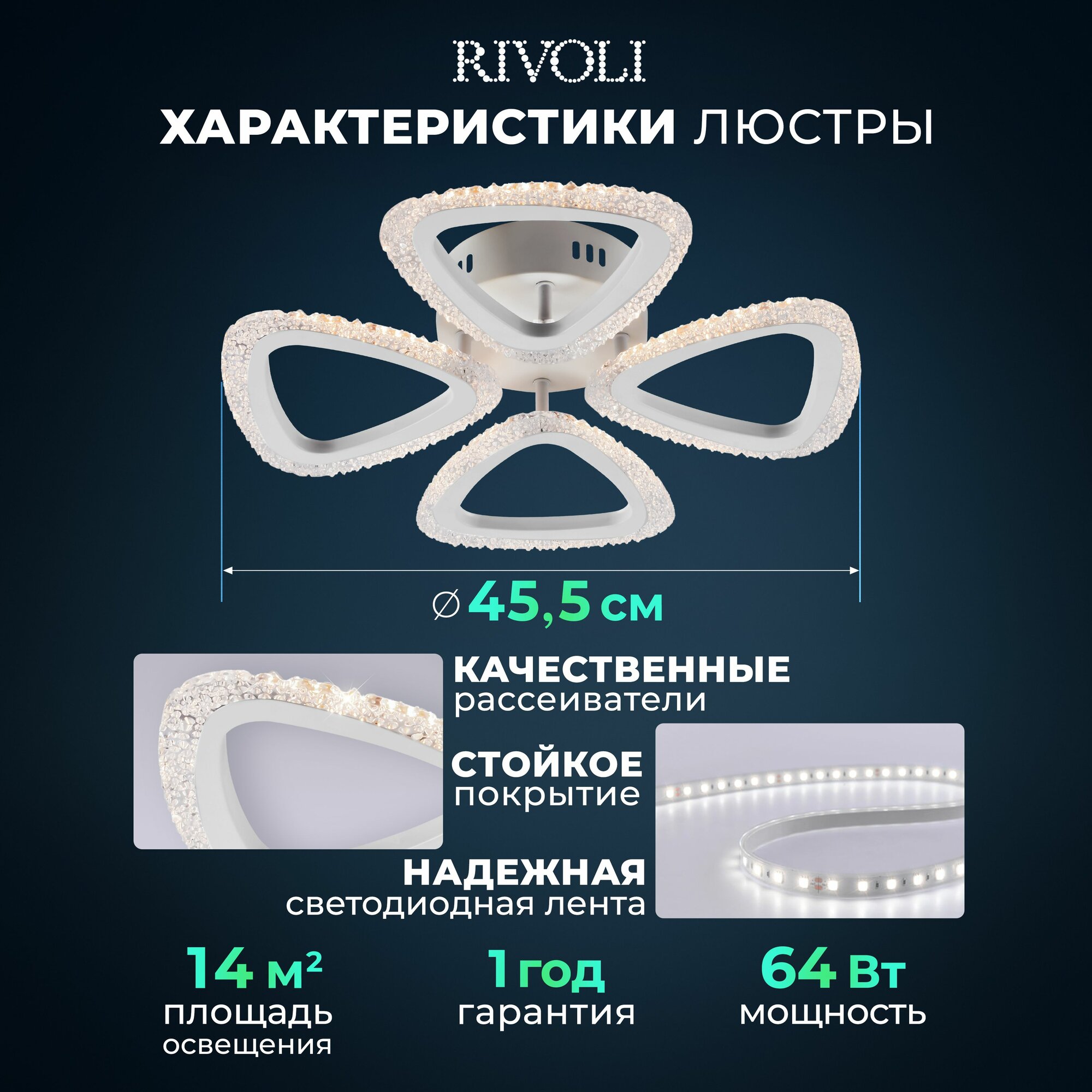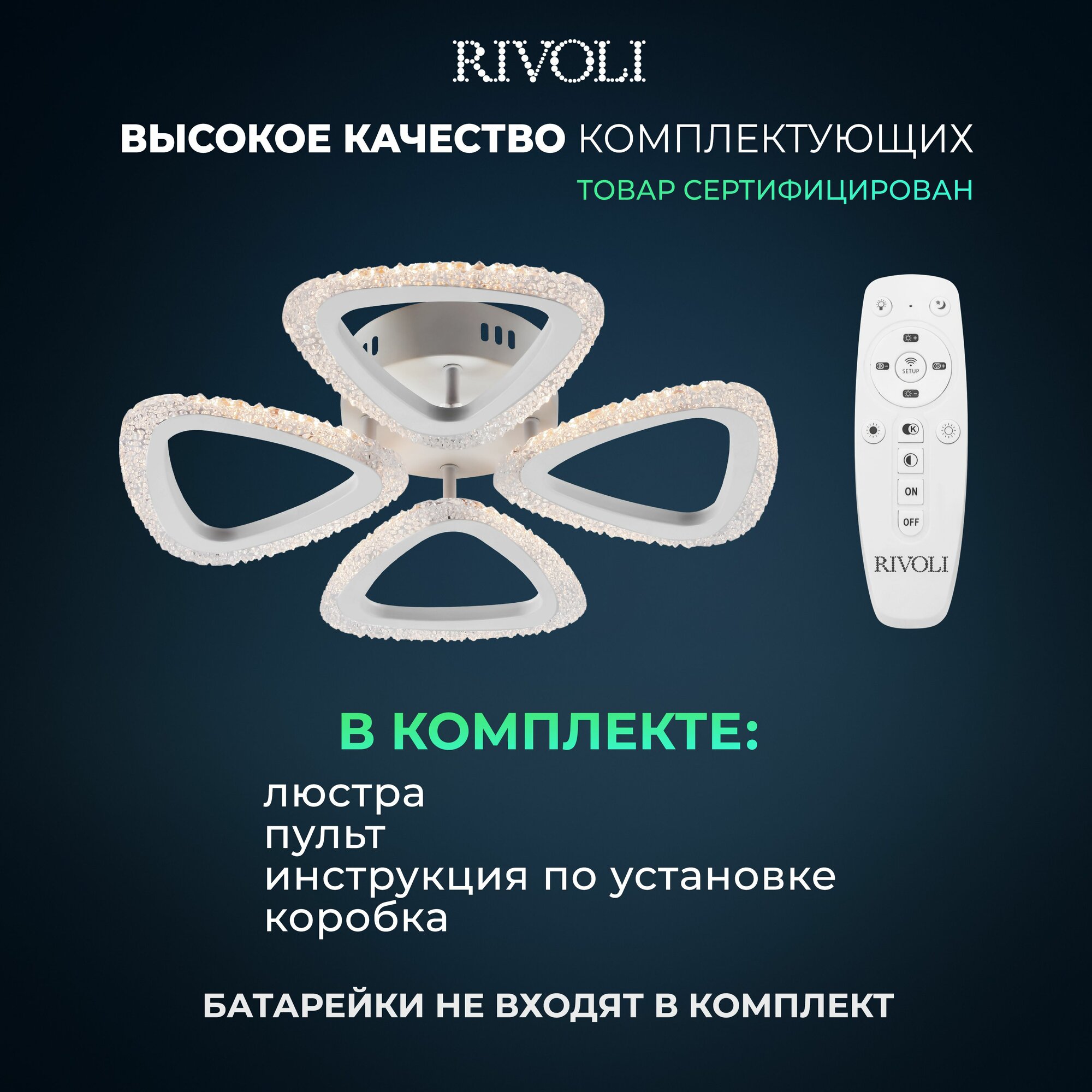Люстра потолочная светодиодная Rivoli Alicia 6093-105 - это современное и стильное решение для освещения вашего дома. Она выполнена в модерном дизайне и оснащена пультом дистанционного управления, что позволяет легко и быстро регулировать яркость и цветовую температуру света.Особенностью данной модели является возможность выбора цветовой температуры и регулировки яркости света. Это позволяет создать комфортную атмосферу для отдыха, работы или развлечений.Люстра Rivoli Alicia оснащена одним светодиодным источником света, который обеспечивает яркое и равномерное освещение площади до 18 м².Люстра имеет четыре треугольных LED-плафона, украшенных декоративными акриловыми кристаллами. Это придает ей элегантный и современный вид.Крепление люстры осуществляется на планку, что обеспечивает надежность и устойчивость конструкции.Люстра имеет степень пылевлагозащиты IP20, что делает ее безопасной для использования в жилых помещениях.Управление люстрой осуществляется с помощью пульта дистанционного управления или механического выключателя.Выбирая люстру потолочную светодиодную Rivoli Alicia 6093-105, вы получаете стильное, функциональное и удобное освещение для вашего дома.
