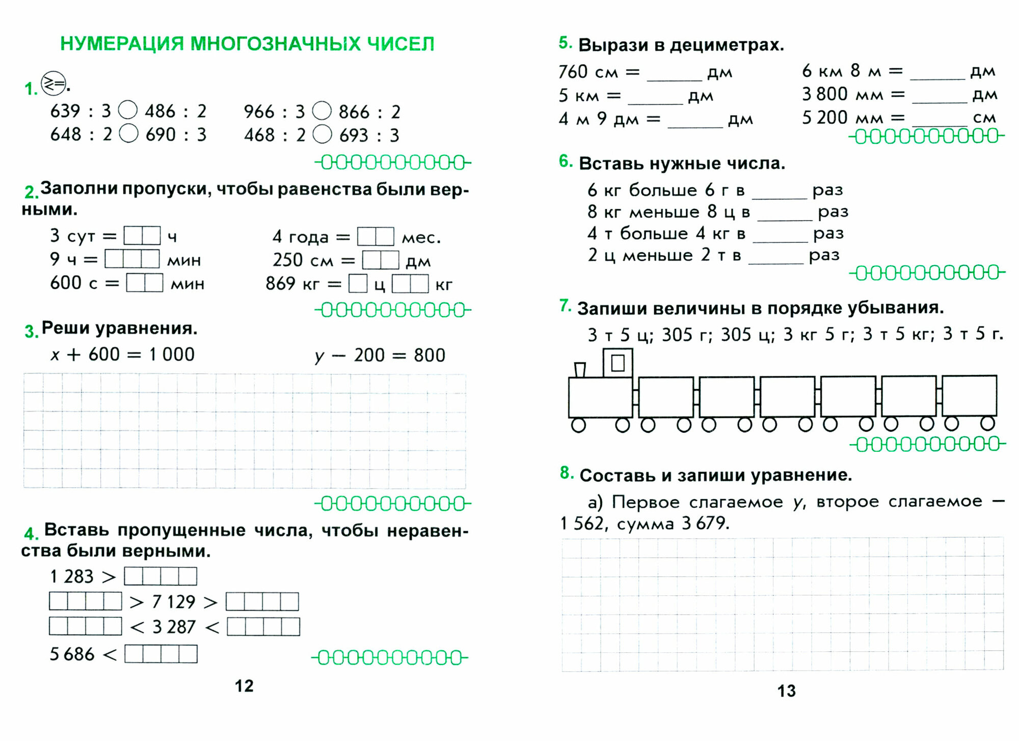 Представленный материал способствует активизации познавательной деятельности учащихся 4 класса, привитию им навыков самостоятельной работы на уроках математики. Это достигается включением в содержание заданий традиционного учебного материала по освоению учащимися нумерации многозначных чисел, устных и письменных приемов сложения и вычитания многозначных чисел, решения текстовых задач, задач геометрического характера (на нахождение площади и периметра геометрических фигур), а также заданий на сравнение величин и действий над ними, на переводы величин из одной системы измерения в другую. Все самостоятельные работы содержат по пять заданий с нарастающей сложностью.